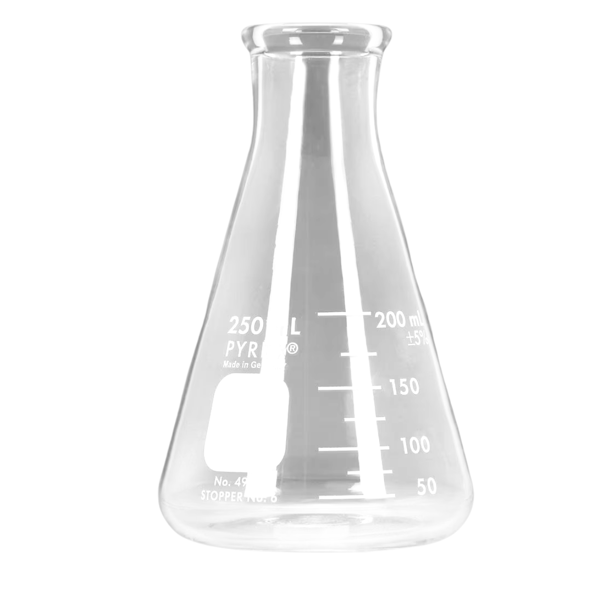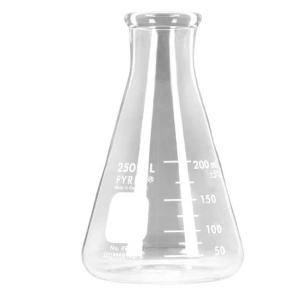 This clear glass Erlenmeyer flask features classic laboratory design with conical body, flat stable base, narrow neck with pour spout, measurement markings (250mL), heat-resistant borosilicate glass construction, and professional scientific styling, offering industrial chic character and academic elegance for science-themed displays, industrial décor, bud vase presentations, and educational styling.