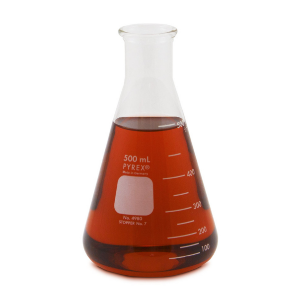 This clear glass Erlenmeyer flask features classic laboratory design with conical body, flat stable base, narrow neck with ridged pour spout, authentic Pyrex branding and measurement markings (500mL), heat-resistant borosilicate glass construction, and professional scientific styling, offering industrial chic character and academic elegance for science-themed displays, industrial décor, bud vase presentations, and educational styling.