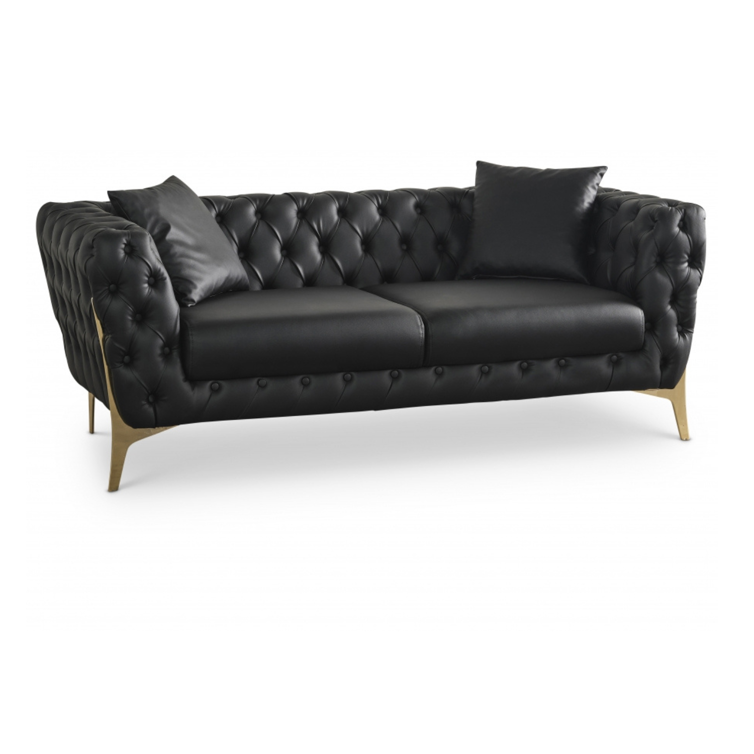 This luxurious Aurora sofa features dramatic deep-button tufted black faux leather upholstery with sculptural curved arms and back, elevated on elegant gold-finished legs. The opulent design with plush cushioning, generous seating, bold silhouette, and glamorous metallic accents creates a striking statement piece that brings sophisticated modern elegance and Hollywood Regency style to any upscale lounge setting.