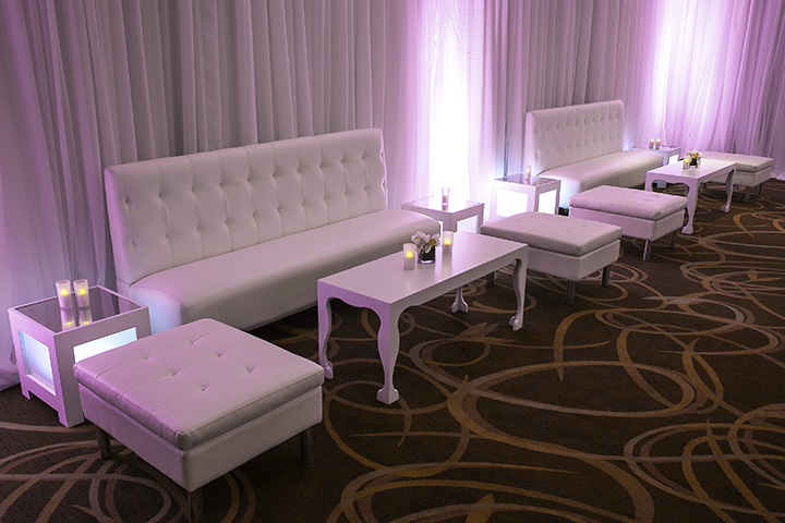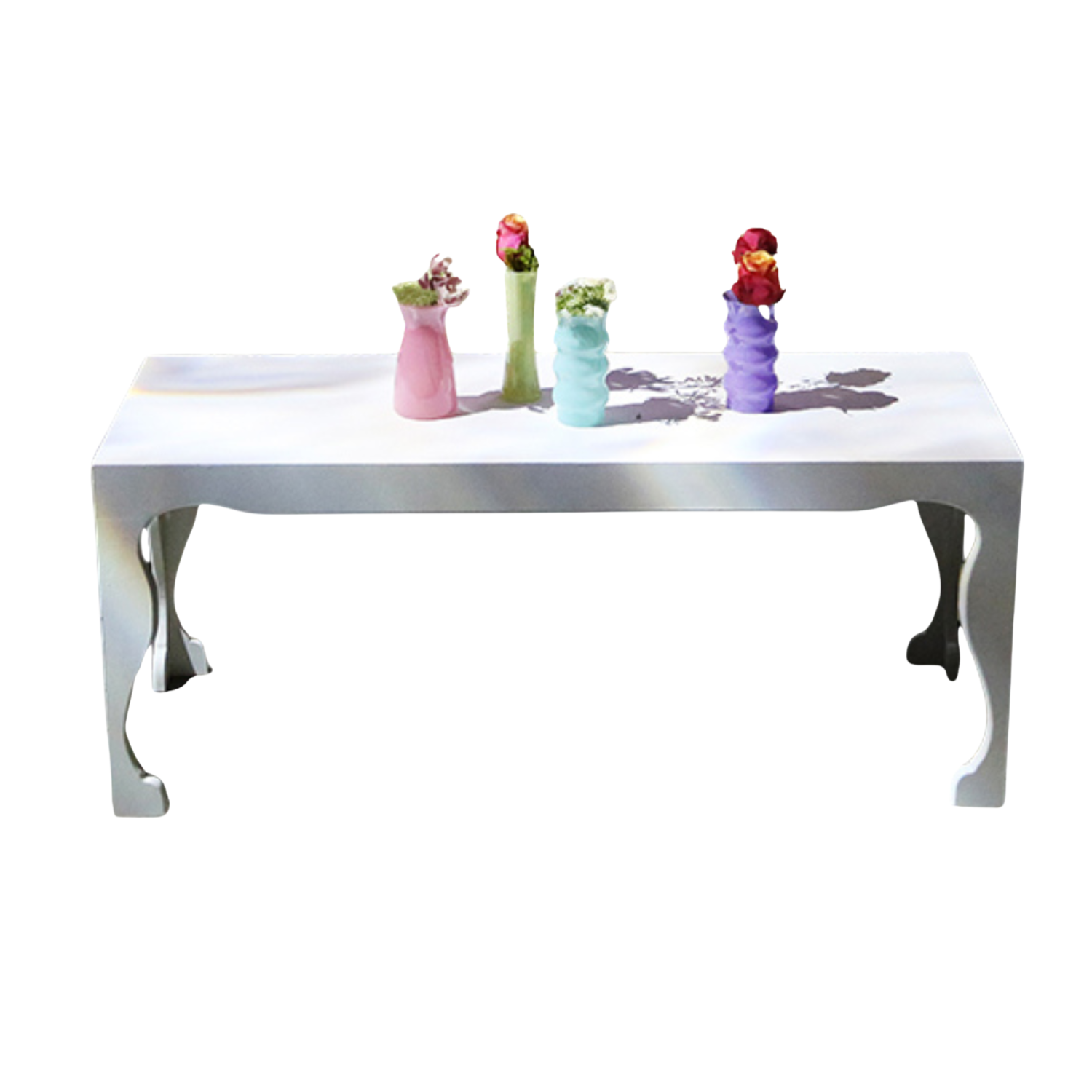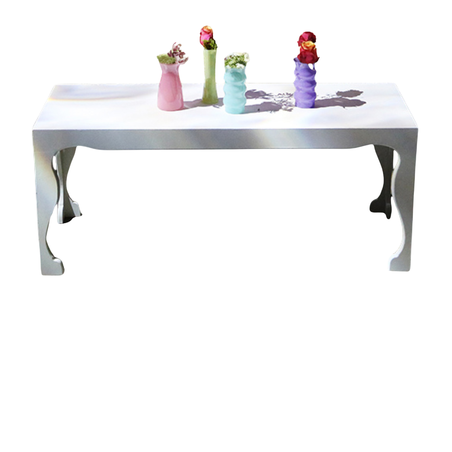 This sleek white lacquer coffee table features dramatic curved baroque-style legs with a modern twist. The glossy finish and sculptural silhouette create a stunning contrast between classic ornamental design and contemporary minimalism, making it a versatile centerpiece for lounge areas that adds both elegance and visual interest to any event space.