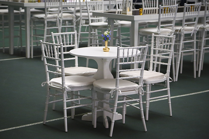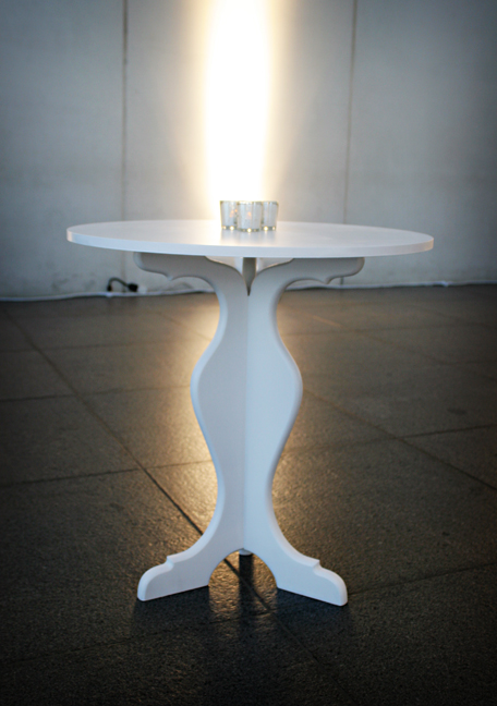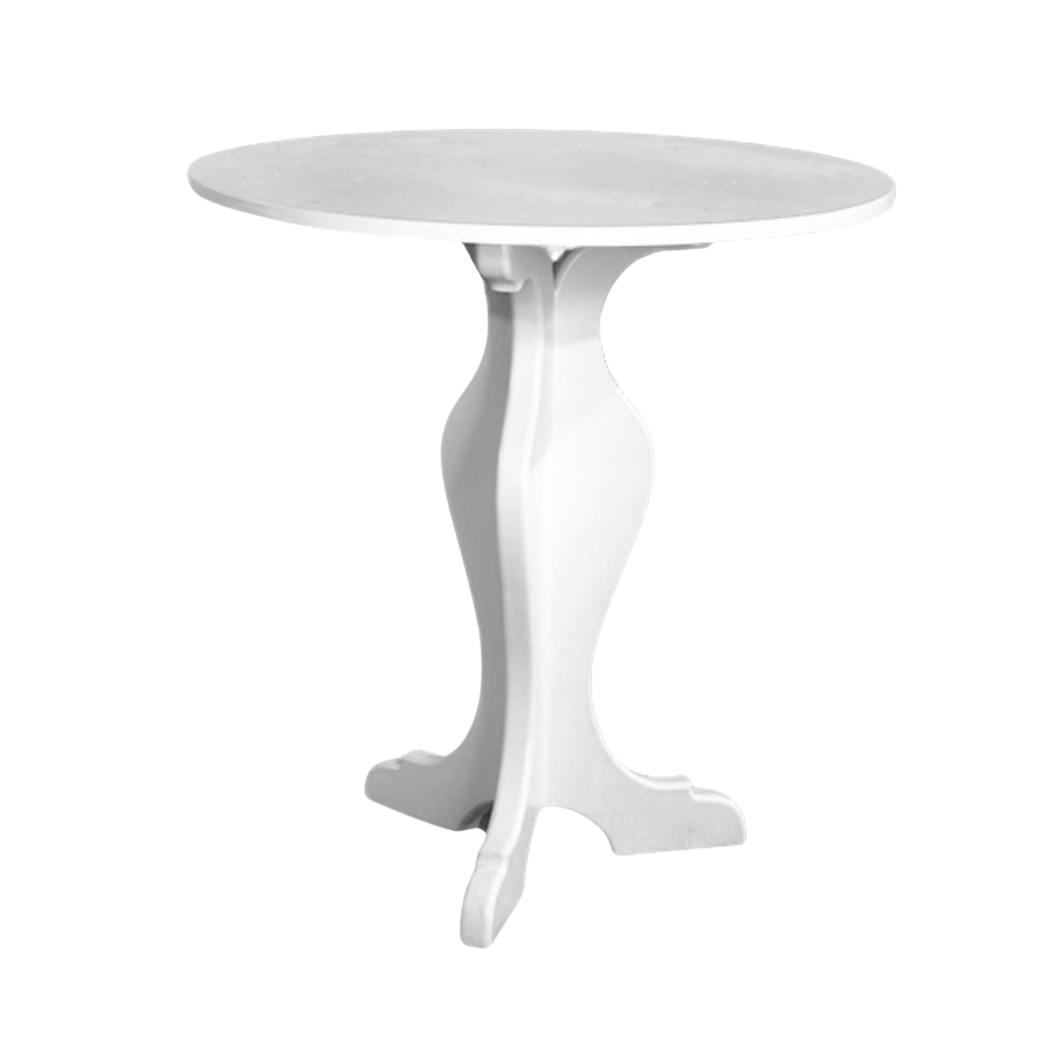 This elegant low-height table features a graceful baroque-inspired white pedestal base with curved silhouette and a smooth round top. The classic design with ornate detailing brings timeless sophistication to seating areas, perfect for intimate dining or lounge settings at refined events.