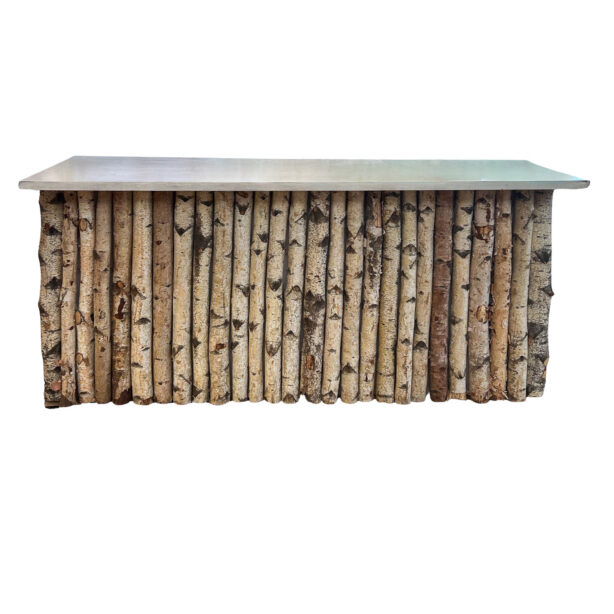 This rustic birch log bar features authentic natural birch branch facade with characteristic white and cream bark, smooth top serving surface, rectangular bar construction covered in real birch logs creating organic woodland texture, natural wood variations and knots, substantial serving counter perfect for beverage service, rustic forest aesthetic with genuine tree branch detailing, sturdy construction, and charming natural element creating distinctive focal point for outdoor-inspired and rustic event styling.