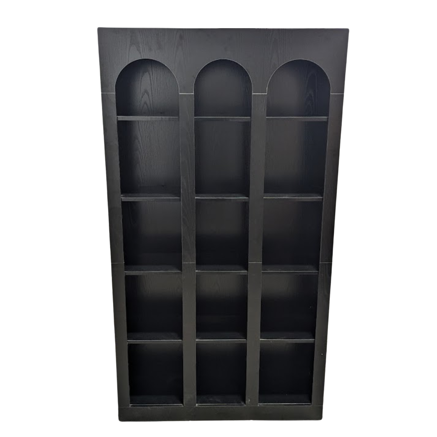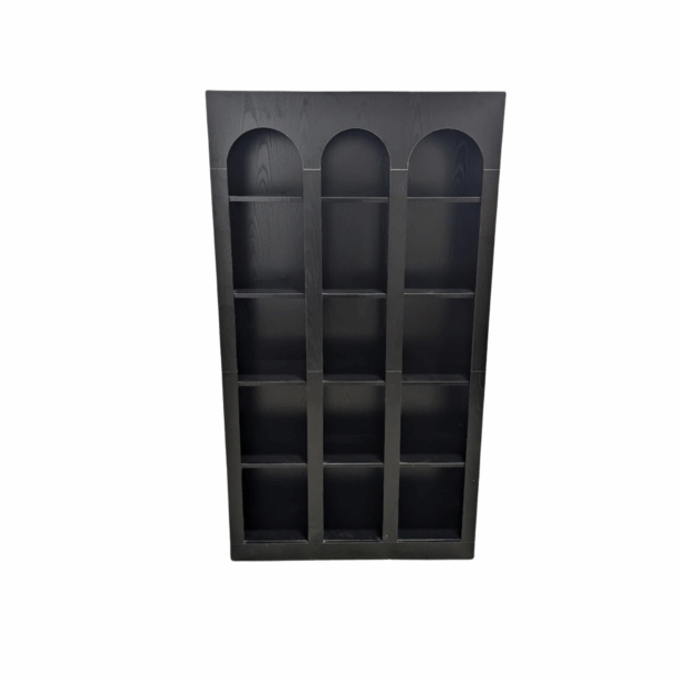 The Black Bookshelf Bar Back features arched alcove shelving with Gothic-inspired design for dramatic bottle and display presentation. This striking piece adds architectural interest and ample storage behind any bar.