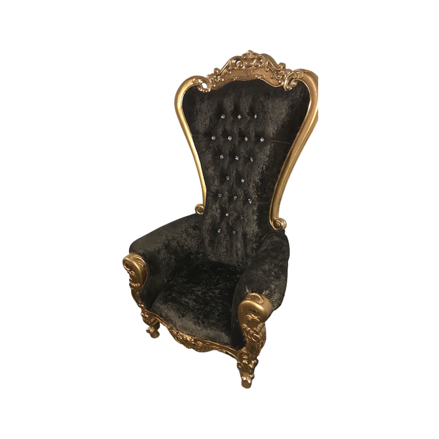 This regal throne chair features luxurious black crushed velvet upholstery with crystal button tufting, framed by ornate gold-finished carved wood details. The dramatic high-back silhouette with baroque scrollwork, curved arms with elaborate detailing, and opulent color combination creates a majestic statement piece that brings royal grandeur and sophisticated glamour to any premium event setting.