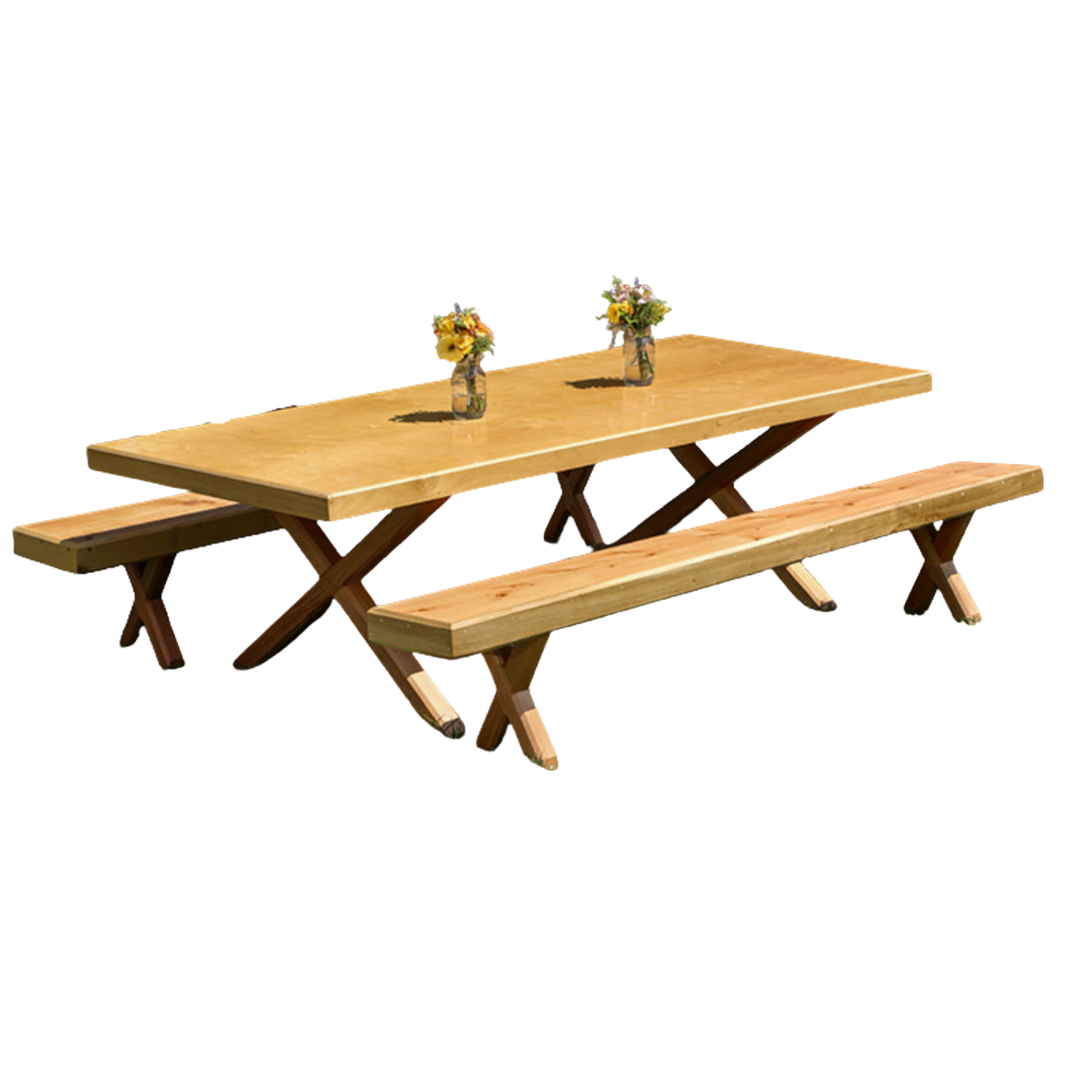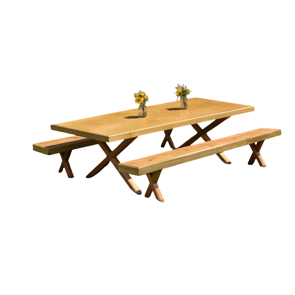 This charming farmhouse-style dining set features a natural blonde wood table with matching benches, supported by sturdy crossed wooden legs that evoke classic picnic aesthetics. The warm honey-toned finish and rustic construction create an inviting communal dining experience that brings casual outdoor charm to any gathering while maintaining durability and authentic countryside appeal.