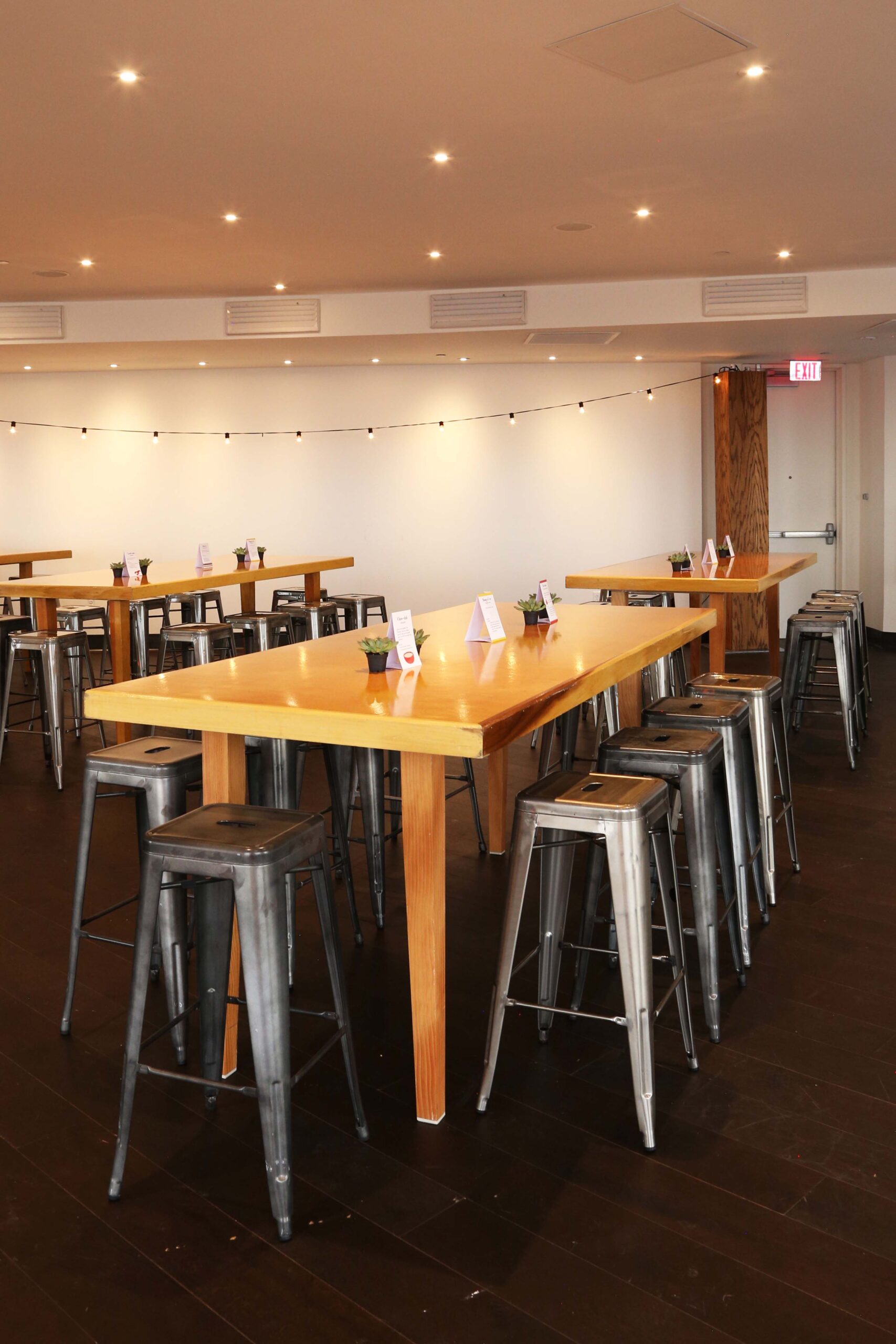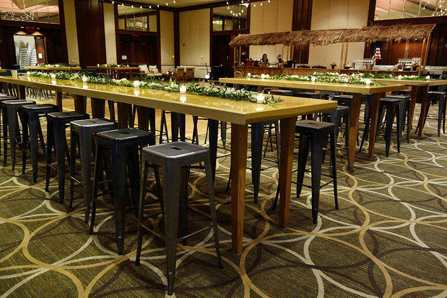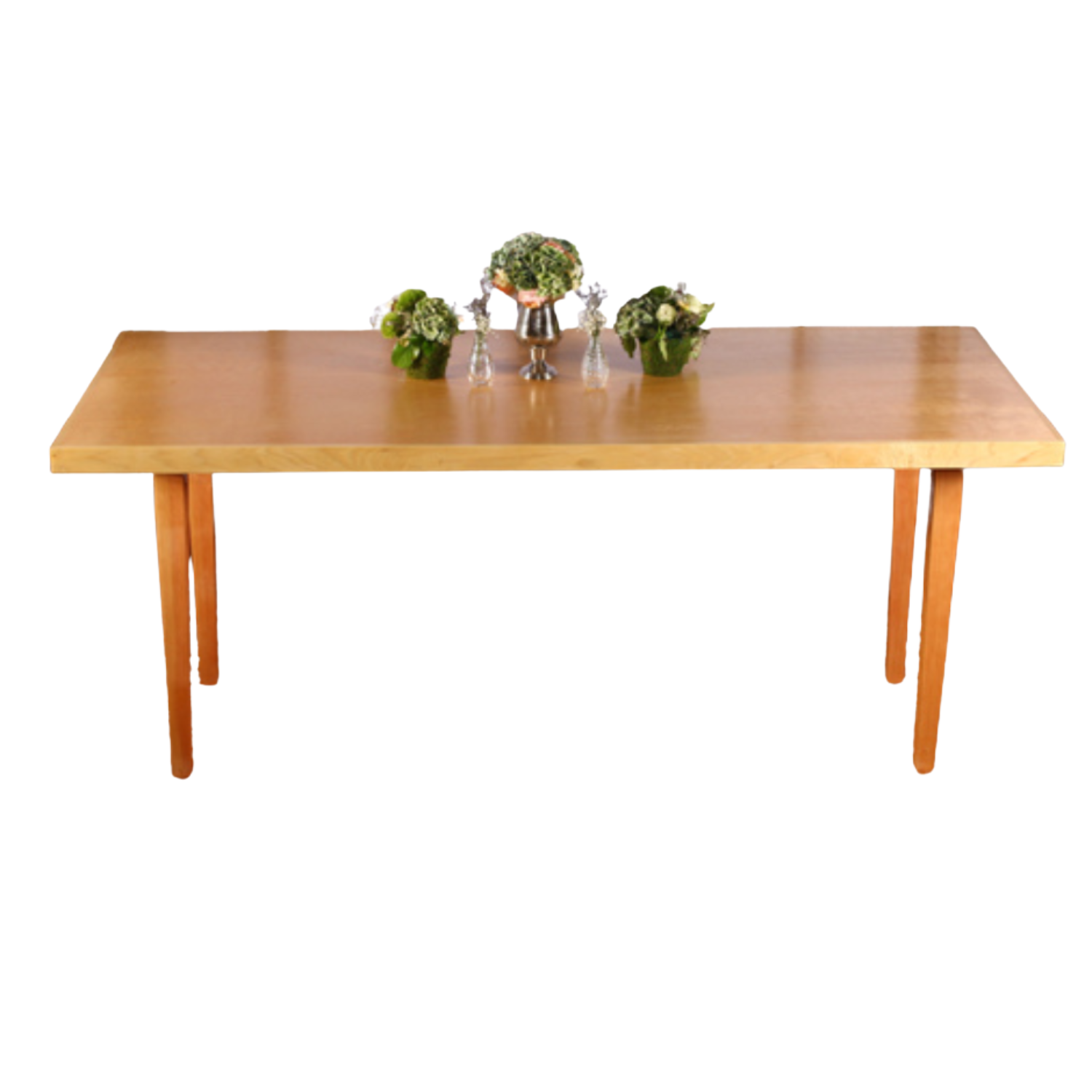 This versatile high-top communal table features a warm blonde wood finish with a smooth, polished surface supported by sturdy wooden legs that bring natural warmth to any event space. The clean lines and honey-toned wood grain create an inviting gathering spot that balances casual accessibility with refined style, perfect for encouraging guest interaction in standing reception settings.