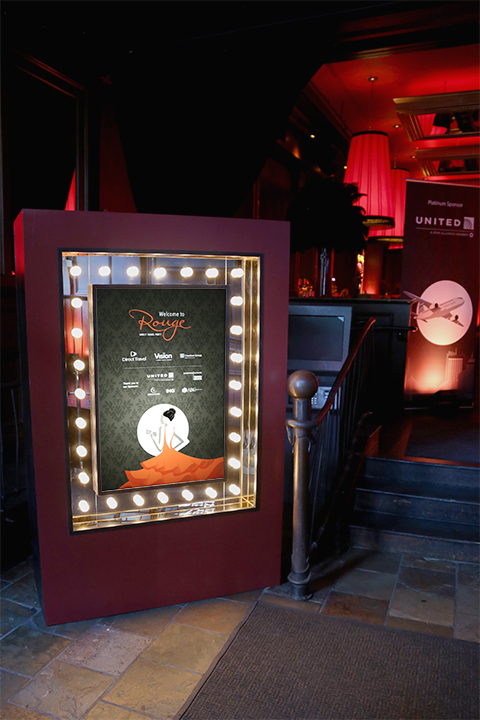 This illuminated marquee frame brings vintage theater charm with glowing border bulbs surrounding customizable signage or graphics. The classic cinema-style display creates eye-catching announcements and photo moments, perfect for showcasing event details, menus, or messages with retro sophistication.