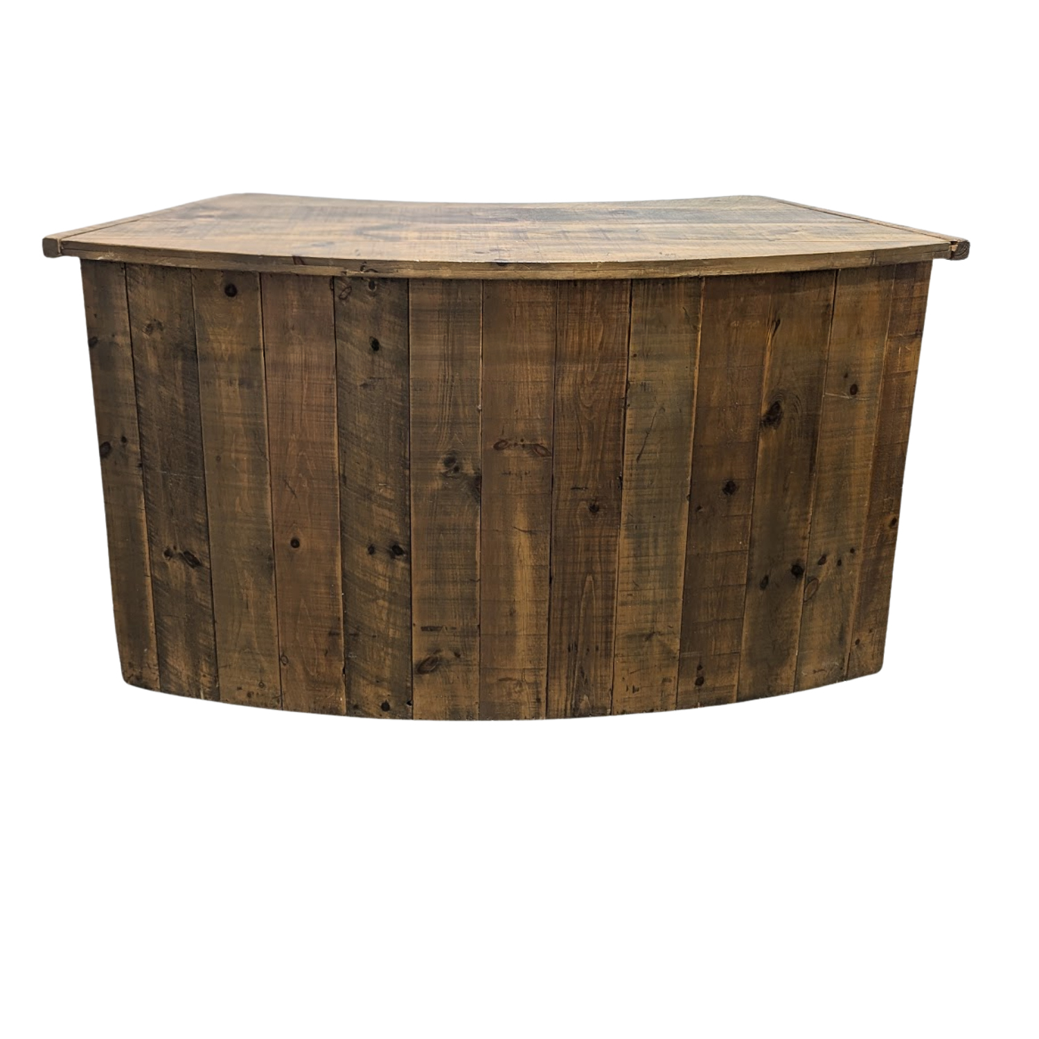This serpentine curved rustic bar features reclaimed wood construction with convex curved front profile, vertical plank facade in weathered brown tones, smooth top serving surface with live edge character, distinctive curved serpentine shape creating elegant flowing design, natural wood grain variations and distressed finish adding authentic character, substantial serving counter perfect for beverage service, and sophisticated rustic aesthetic combining farmhouse charm with graceful curved architectural styling.
