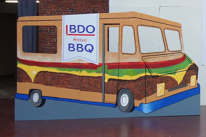 This colorful BBQ food truck facade features cartoon-style design with vibrant oversized hamburger graphic wrapping the vehicle body, showing realistic bun, lettuce, tomato, cheese, and beef patty layers, painted windows with rounded corners, customizable white signage panel for branding, bright multi-color scheme with browns, yellows, reds, greens, and blues, dimensional 2D cutout construction, and playful street food character for casual culinary events.
