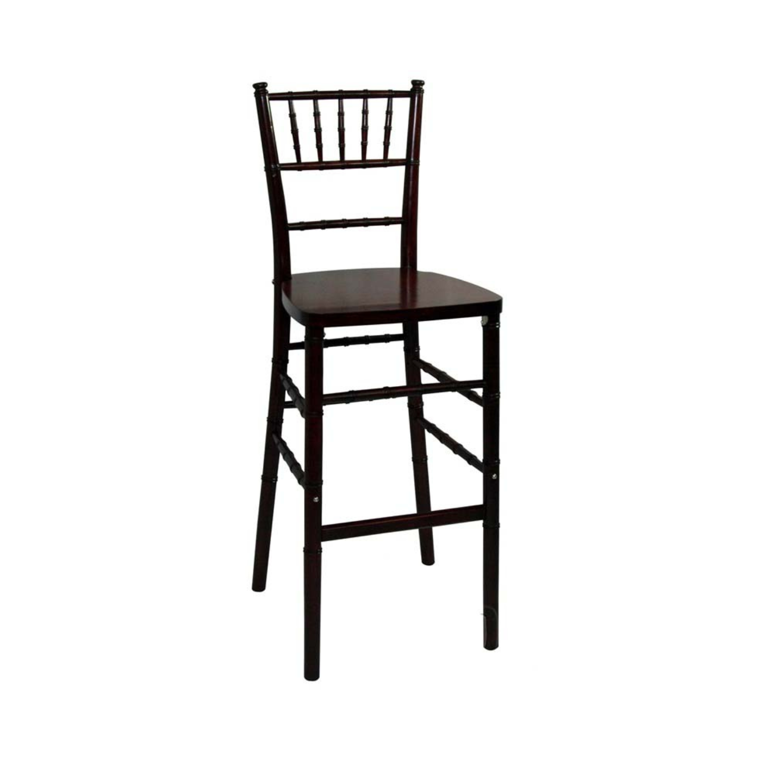 This classic fruitwood chiavari barstool features traditional bamboo-inspired spindle detailing and a rich wood-tone finish that radiates warmth and natural elegance. The elevated silhouette combines lightweight portability with sophisticated height, while the smooth wooden seat provides comfortable perching for extended mingling. The warm fruitwood tone adds organic charm and versatile sophistication that enhances both rustic and refined high-top arrangements.