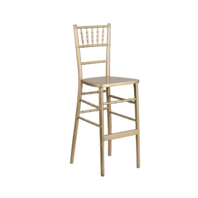 This classic gold chiavari barstool features traditional bamboo-inspired spindle detailing and a lustrous metallic finish that radiates timeless elegance and luxury. The elevated silhouette combines lightweight portability with sophisticated height, while the smooth seat provides comfortable perching for extended mingling. The warm golden tone adds a glamorous accent and opulent sophistication that enhances any upscale high-top arrangement.
