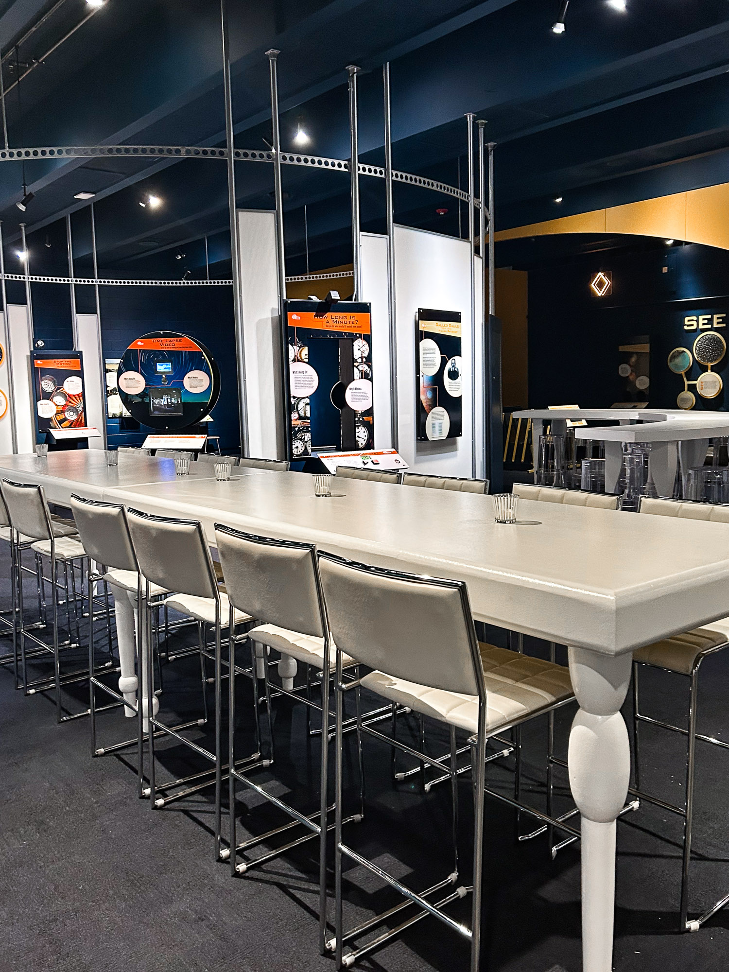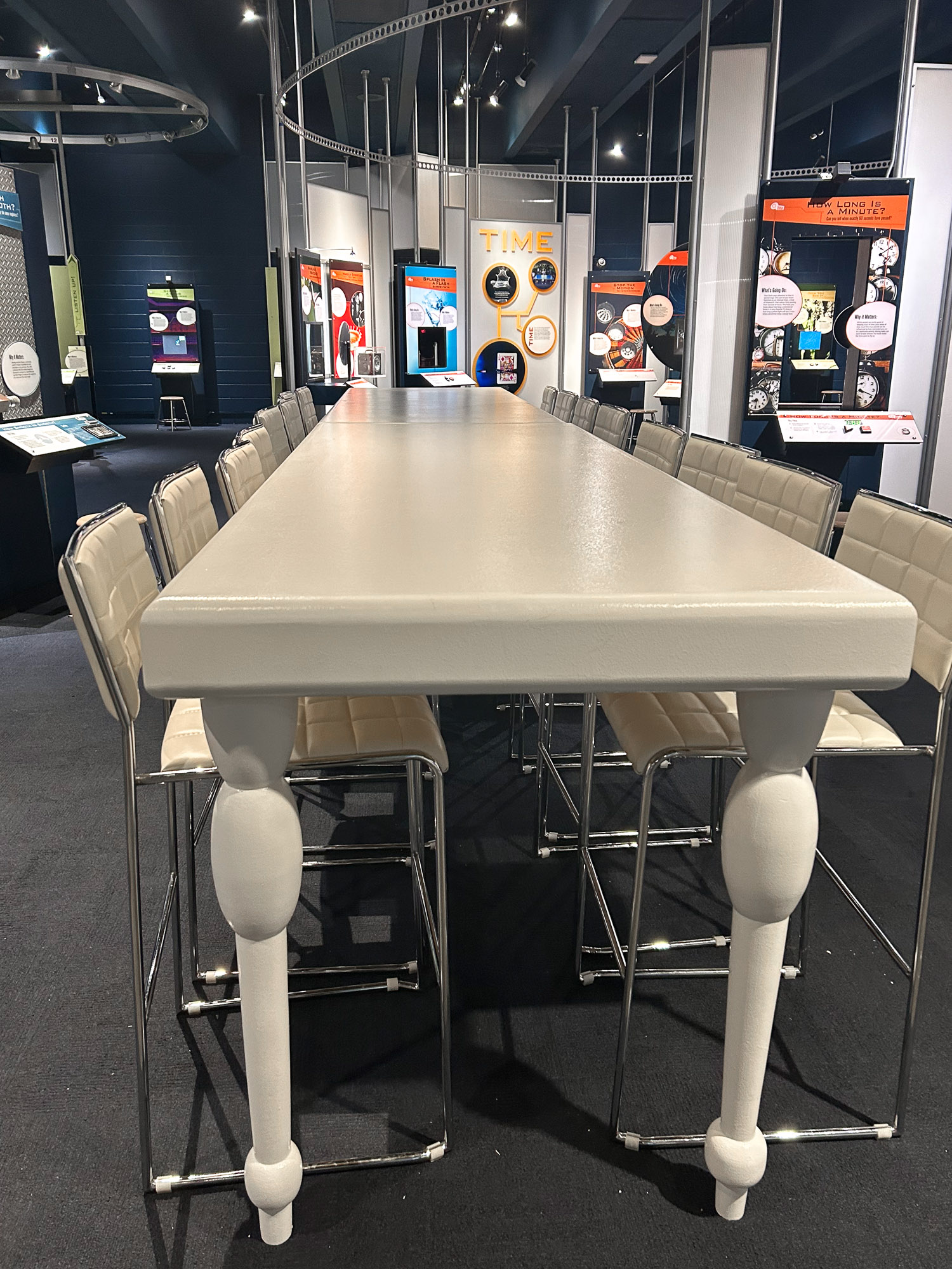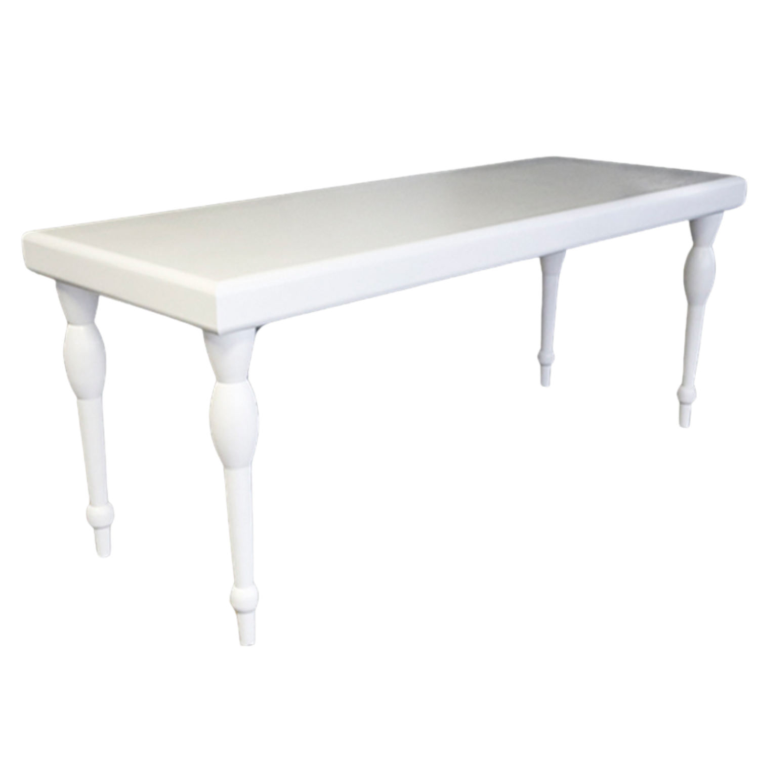 This elegant high-top communal table features a pristine white rectangular surface supported by gracefully turned white legs with classic baluster detailing that evokes traditional craftsmanship. The clean monochromatic design and counter-height proportions create a sophisticated gathering spot that encourages standing conversation and casual mingling while maintaining timeless appeal across various event styles.