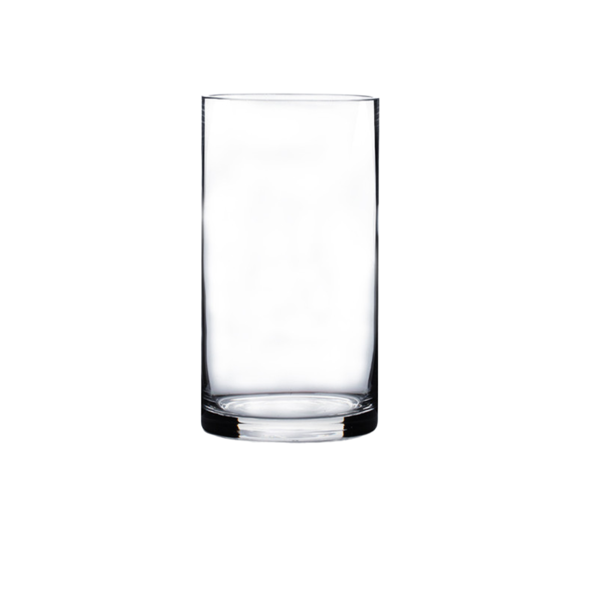 This clear glass cylinder vase features medium-height straight-sided design with flat base and crystal-clear transparency, offering perfect proportions for versatile centerpieces, floral arrangements, and candle displays.