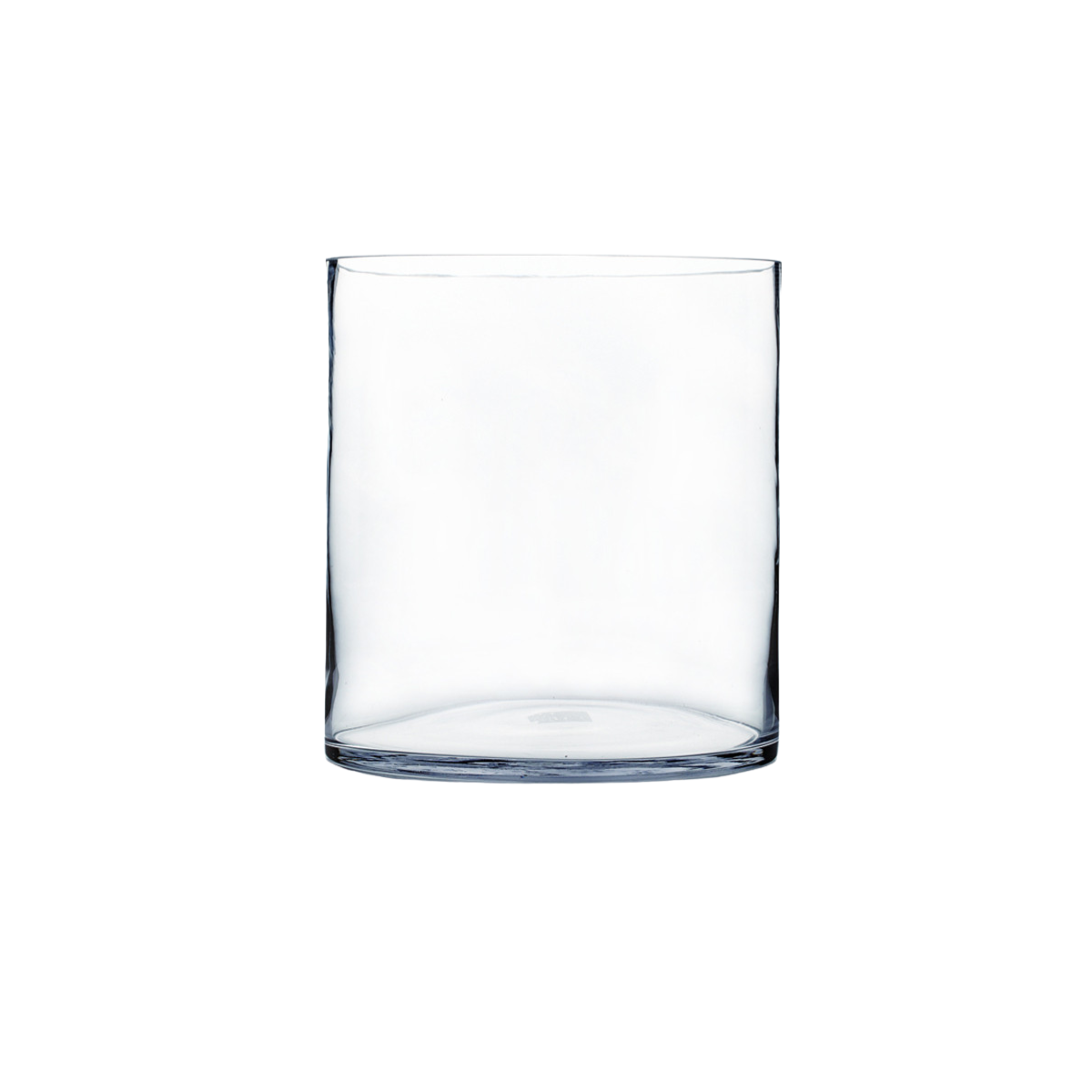 This clear glass cylinder vase features short, wide proportions with straight-sided design and flat base, offering perfect dimensions for low centerpieces, compact floral arrangements, and layered candle displays.