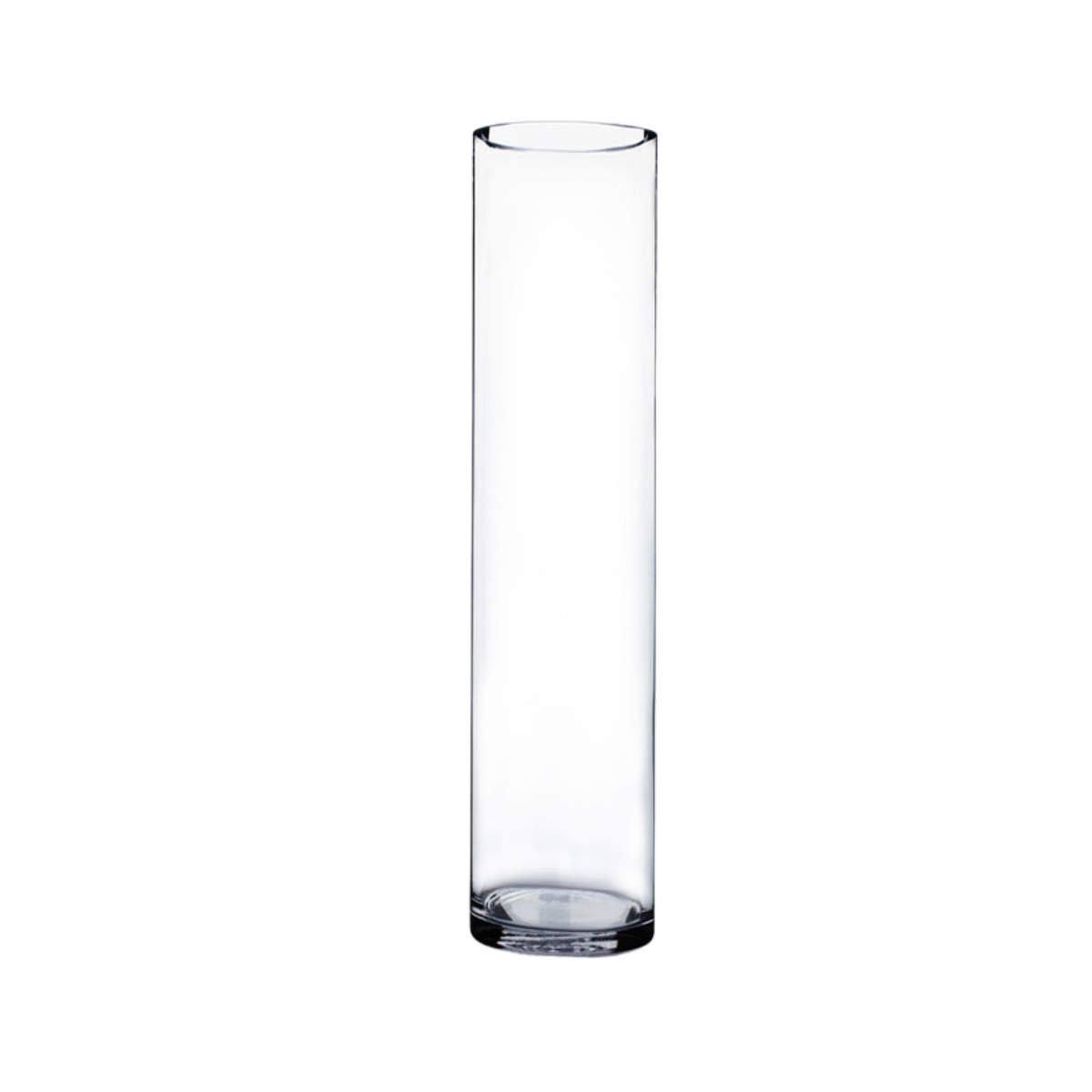 This tall clear glass cylinder vase features sleek straight-sided design with flat base and crystal-clear transparency, offering impressive vertical height for dramatic floral centerpieces and statement decorative displays.