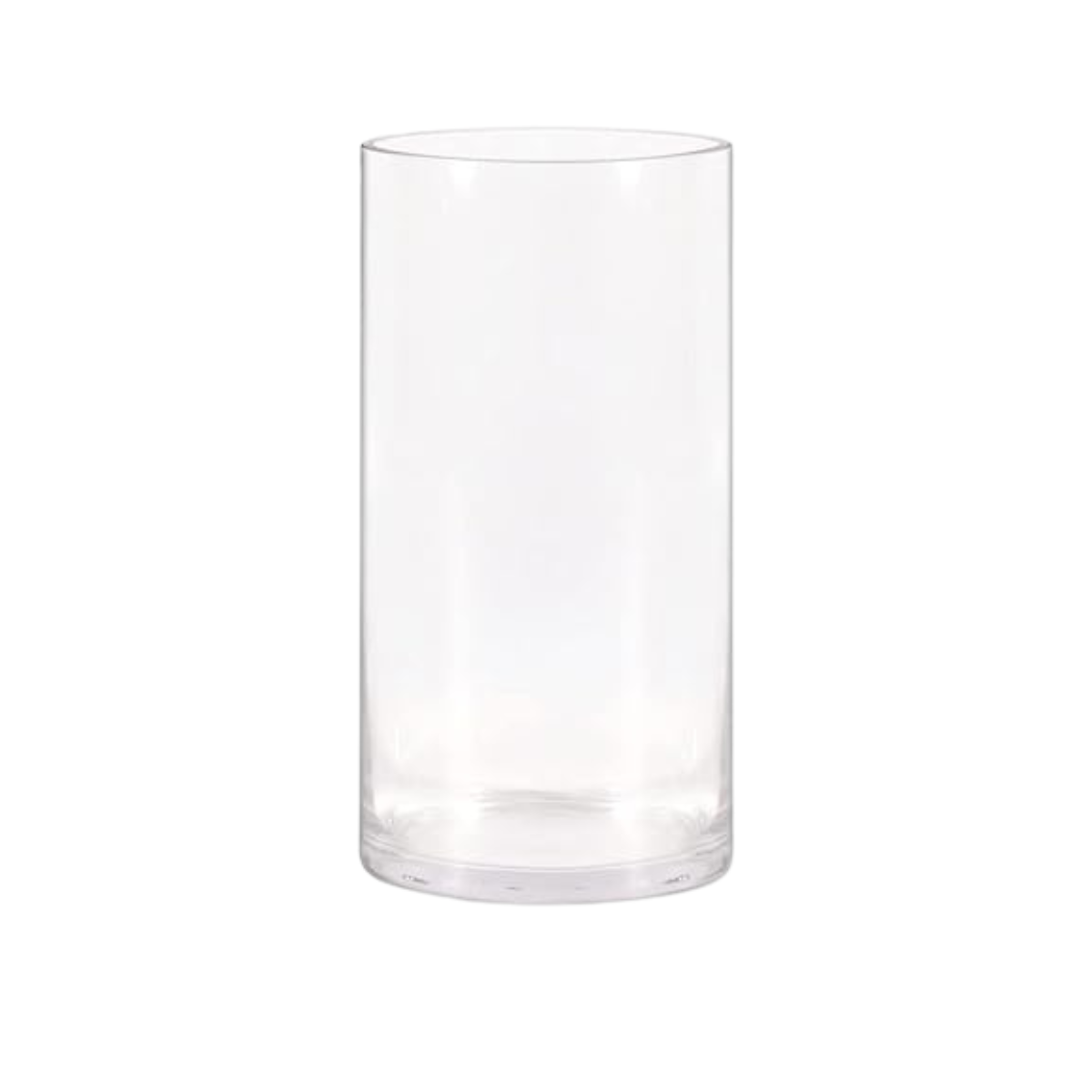 This clear glass cylinder vase features straight-sided design with flat base and crystal-clear transparency, providing versatile modern elegance for floral arrangements, floating candles, and sophisticated centerpieces.