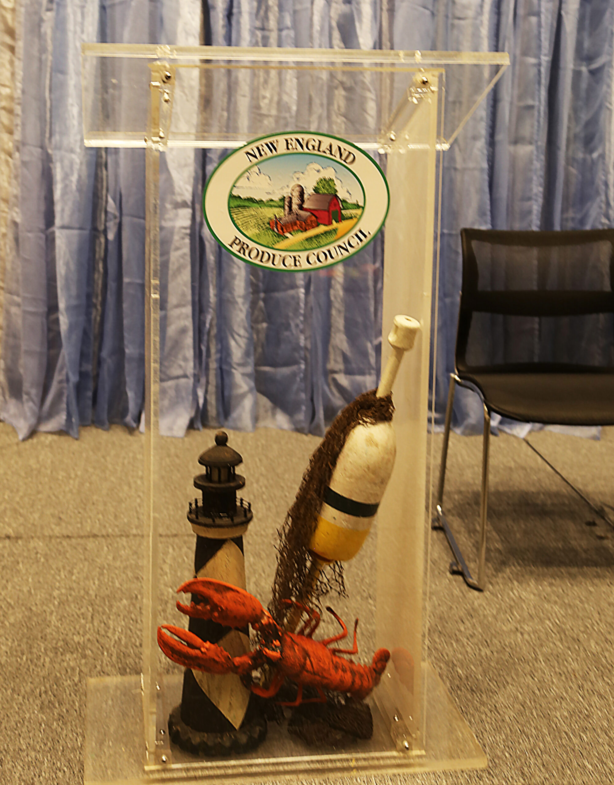 This New England-themed display case features clear acrylic construction with flat top surface, official New England Produce Council logo seal prominently displayed, interior arrangement of iconic regional symbols including painted lighthouse figurine with black and white stripes, bright red lobster sculpture, carved duck decoy, and authentic fishing net accent, mounted on stable base platform, offering authentic coastal New England character and regional pride styling for maritime celebrations, seafood industry events, and New England-themed gatherings.