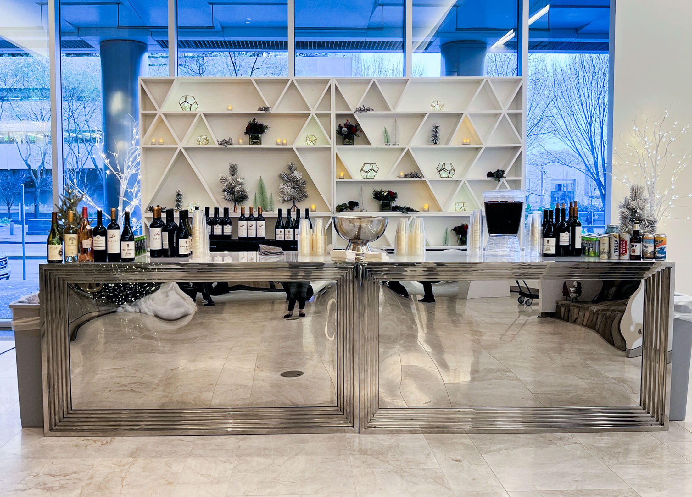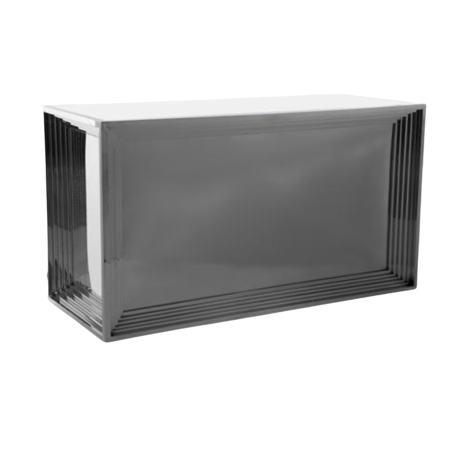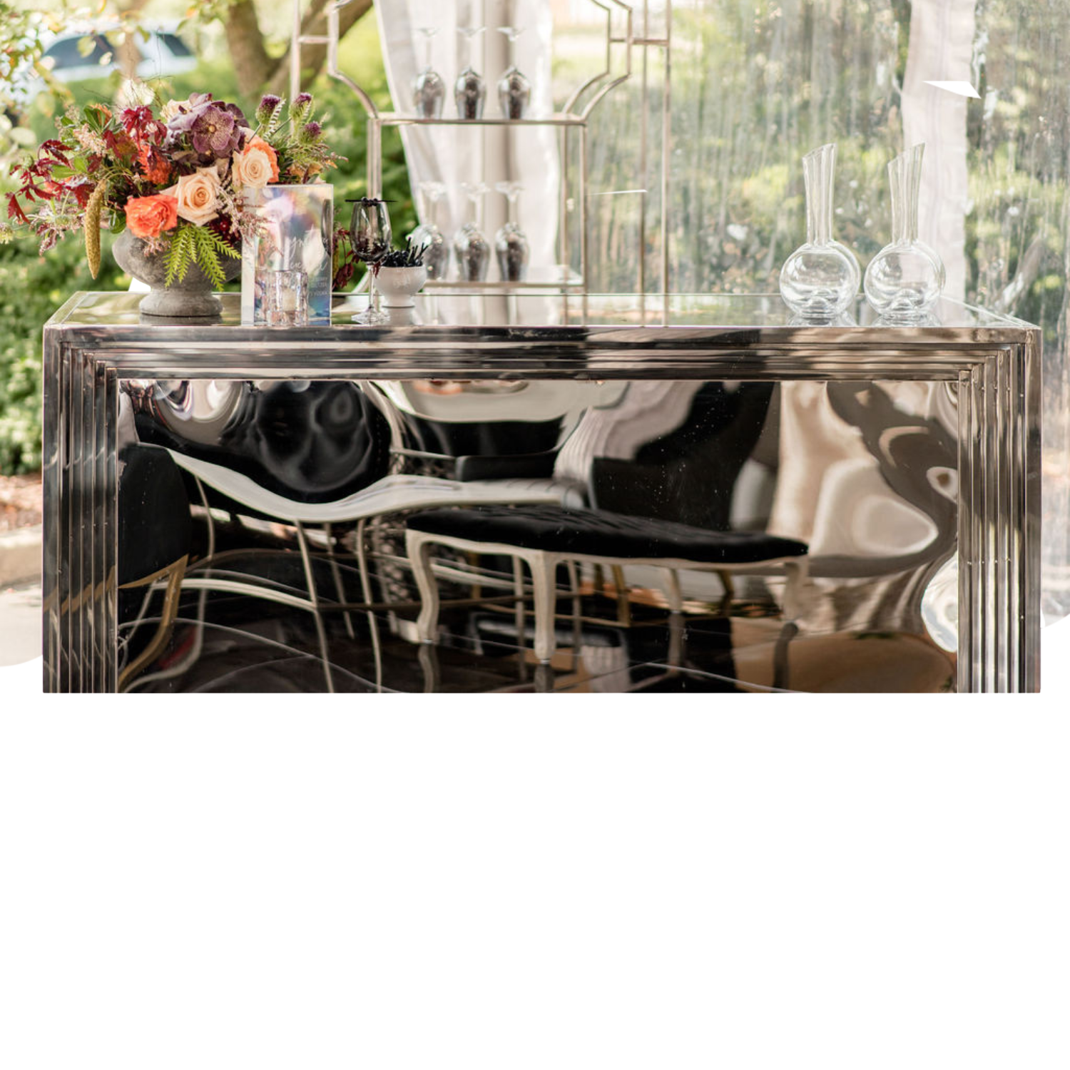 The Criterion Bar makes a bold statement with its striking mirrored finish and distinctive geometric frame design. Featuring a sleek reflective surface that creates depth and visual intrigue, this ultra-modern bar adds contemporary glamour to any space. The architectural stepped frame and polished metallic aesthetic deliver high-impact style that captivates and elevates.
