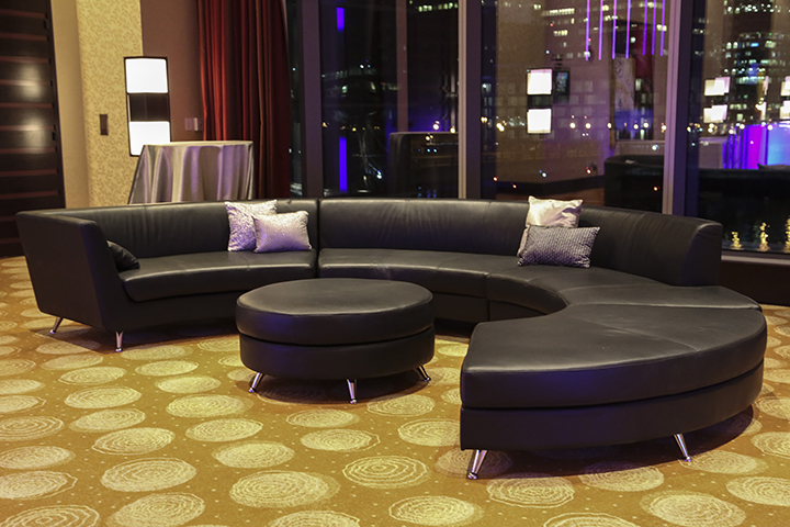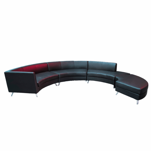 This sophisticated curved sectional features sleek black faux leather upholstery with modern modular design, flowing serpentine shape, and polished chrome legs. The contemporary configuration with smooth lines, generous seating, coordinating ottoman, and dramatic arc creates versatile conversation-focused seating that brings upscale modern elegance and dynamic visual interest to any lounge setting.