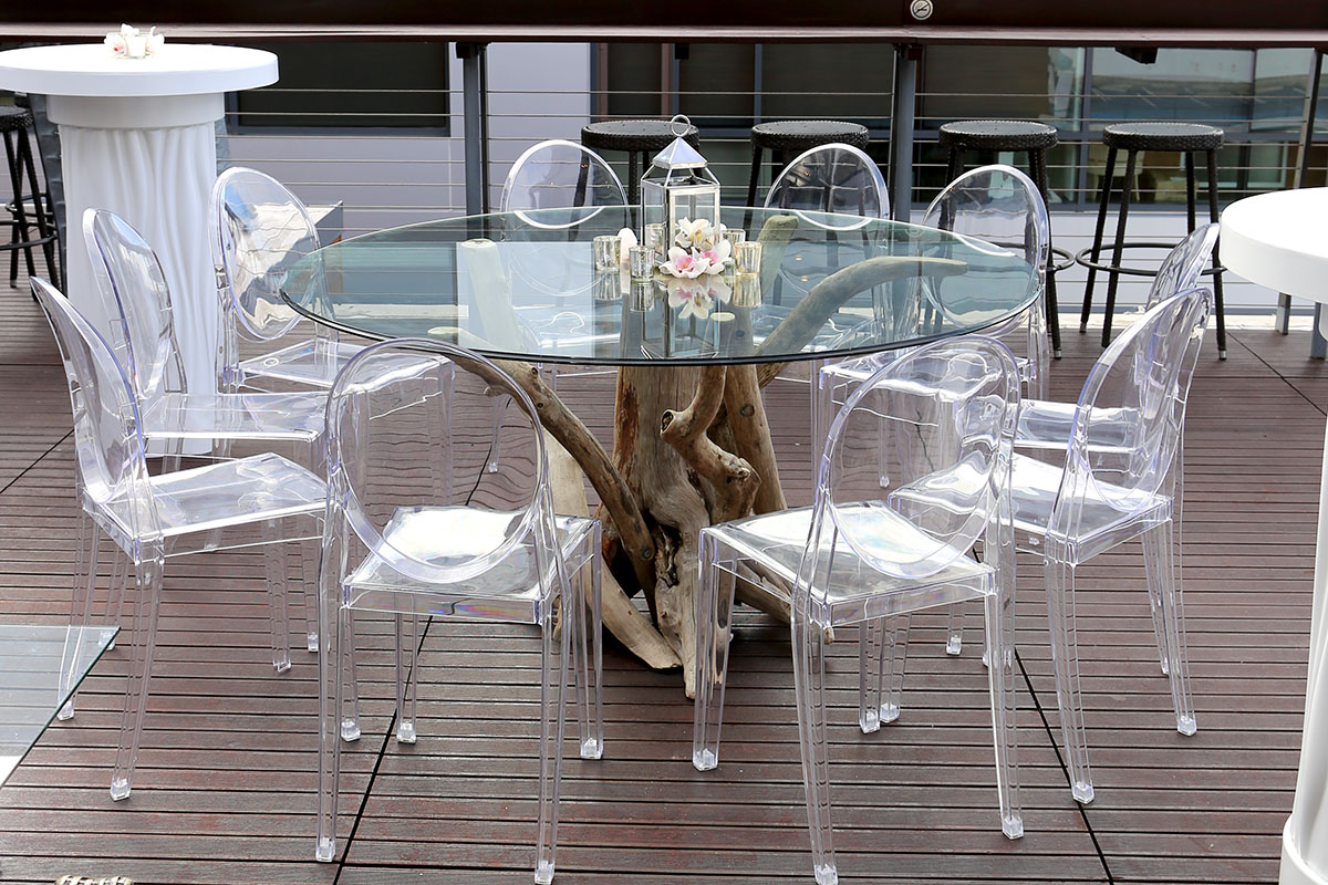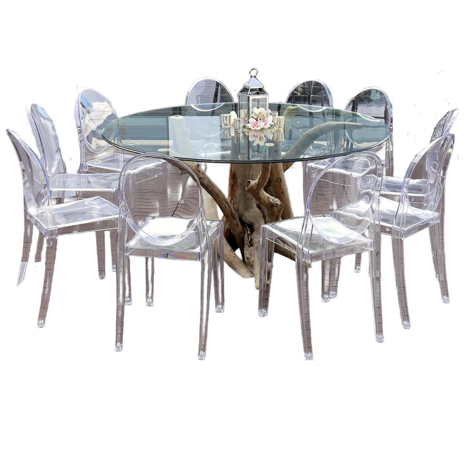 This stunning organic dining table showcases a dramatic natural driftwood base with sculptural twisted branches supporting a sleek round glass top. The weathered wood’s raw, artistic form contrasts beautifully with the transparent surface, creating an eye-catching statement piece that brings coastal elegance and nature-inspired sophistication to any dining arrangement.