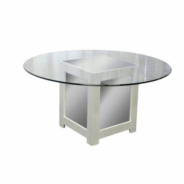 This sophisticated contemporary dining table pairs a sleek round glass top with a distinctive white geometric pedestal base featuring architectural paneling and clean lines. The transparent surface creates an airy, open feeling while showcasing the sculptural base beneath, offering modern elegance that seamlessly integrates into any upscale event setting with minimal visual weight.