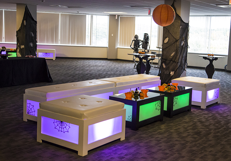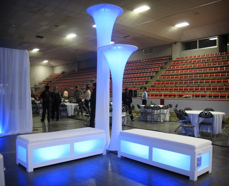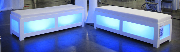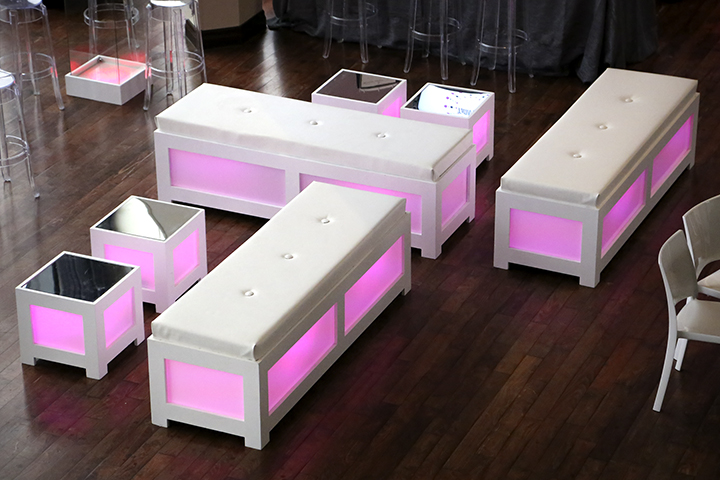 This versatile contemporary bench features crisp white framing with tufted ivory cushioned seating and innovative LED-illuminated panels that glow in customizable colors. The clean-lined rectangular design includes open side panels perfect for showcasing dynamic lighting effects, while the plush button-tufted top cushion provides comfortable seating. The modular construction allows for flexible arrangements to create straight lines, L-shapes, or facing configurations, making it ideal for crafting custom lounge areas that adapt to any venue layout.