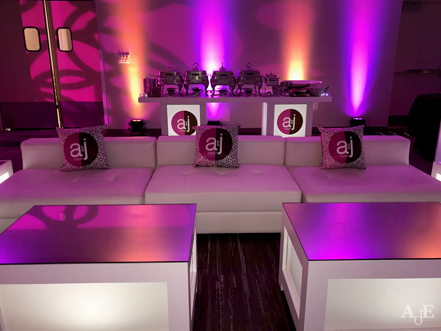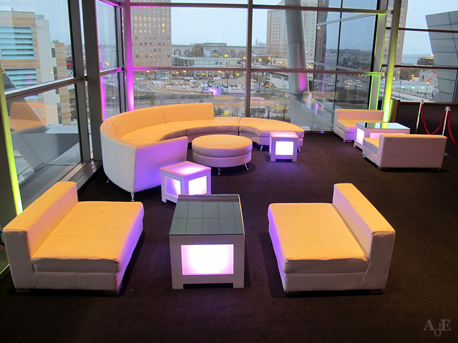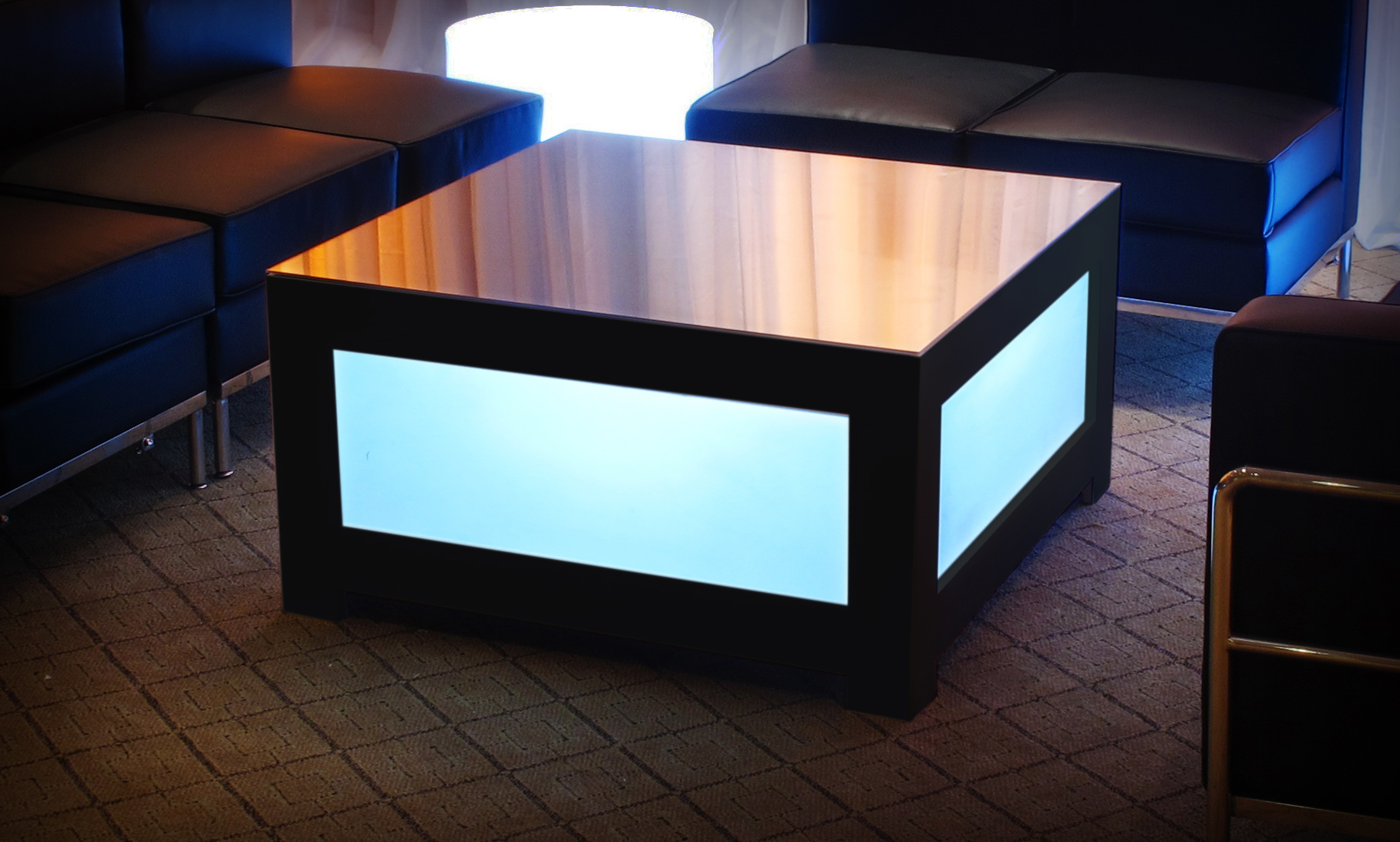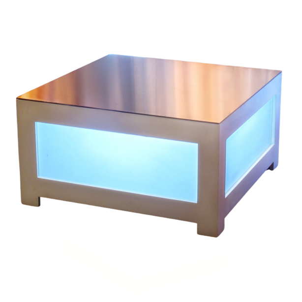 This modern LED coffee table features a sleek mirrored or glass top with color-changing illuminated side panels framed by black or white edges. The square design and customizable lighting create a vibrant glowing effect that transforms the ambiance, making it a dynamic centerpiece perfect for contemporary lounge areas seeking bold visual impact.