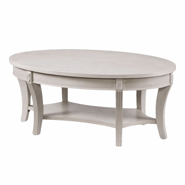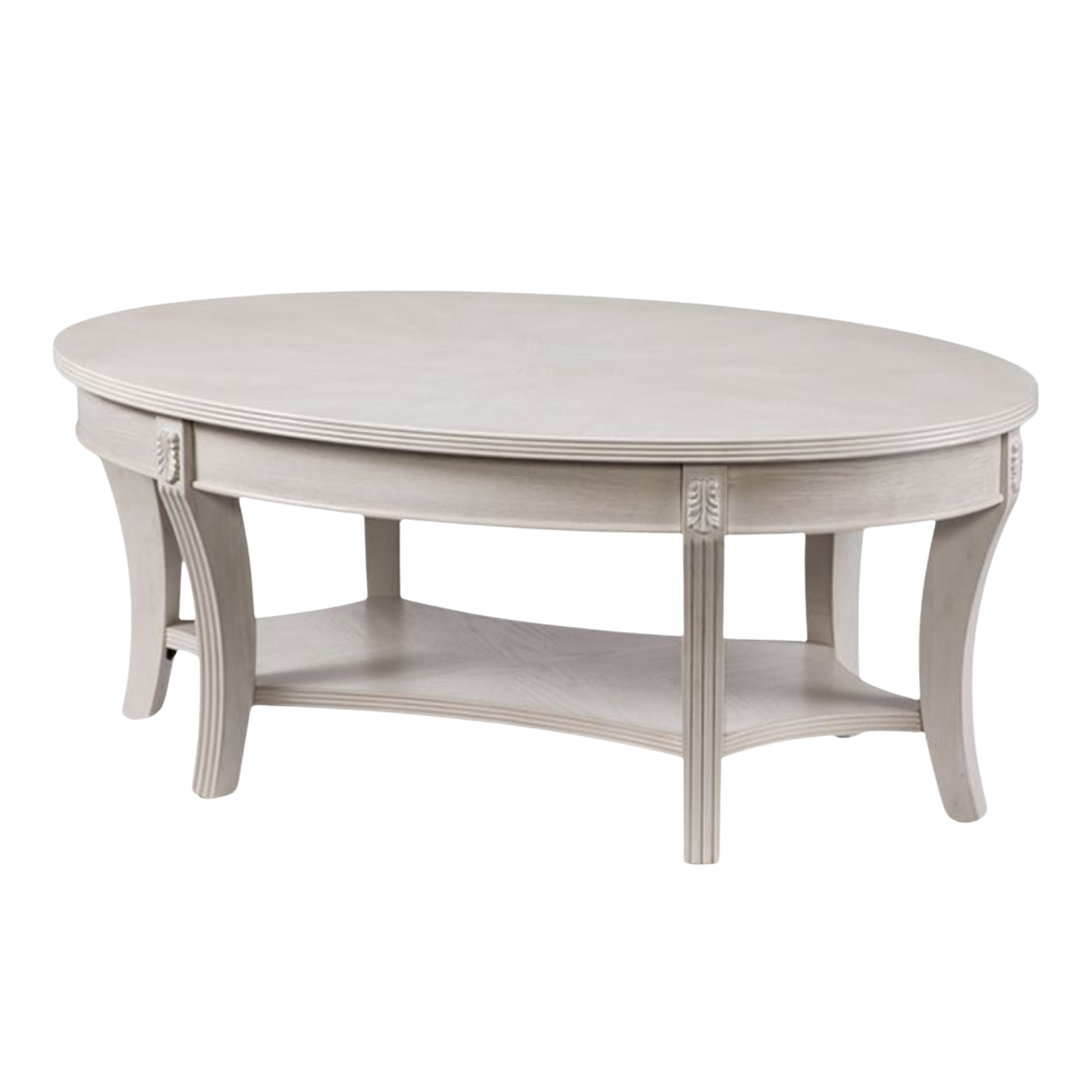 This elegant oval coffee table features a soft antique white finish with graceful curved legs, decorative carved detailing, and a convenient lower shelf for storage or display. The classic French country design combines timeless sophistication with practical functionality, creating a charming centerpiece that adds romantic European elegance to traditional or transitional lounge settings.