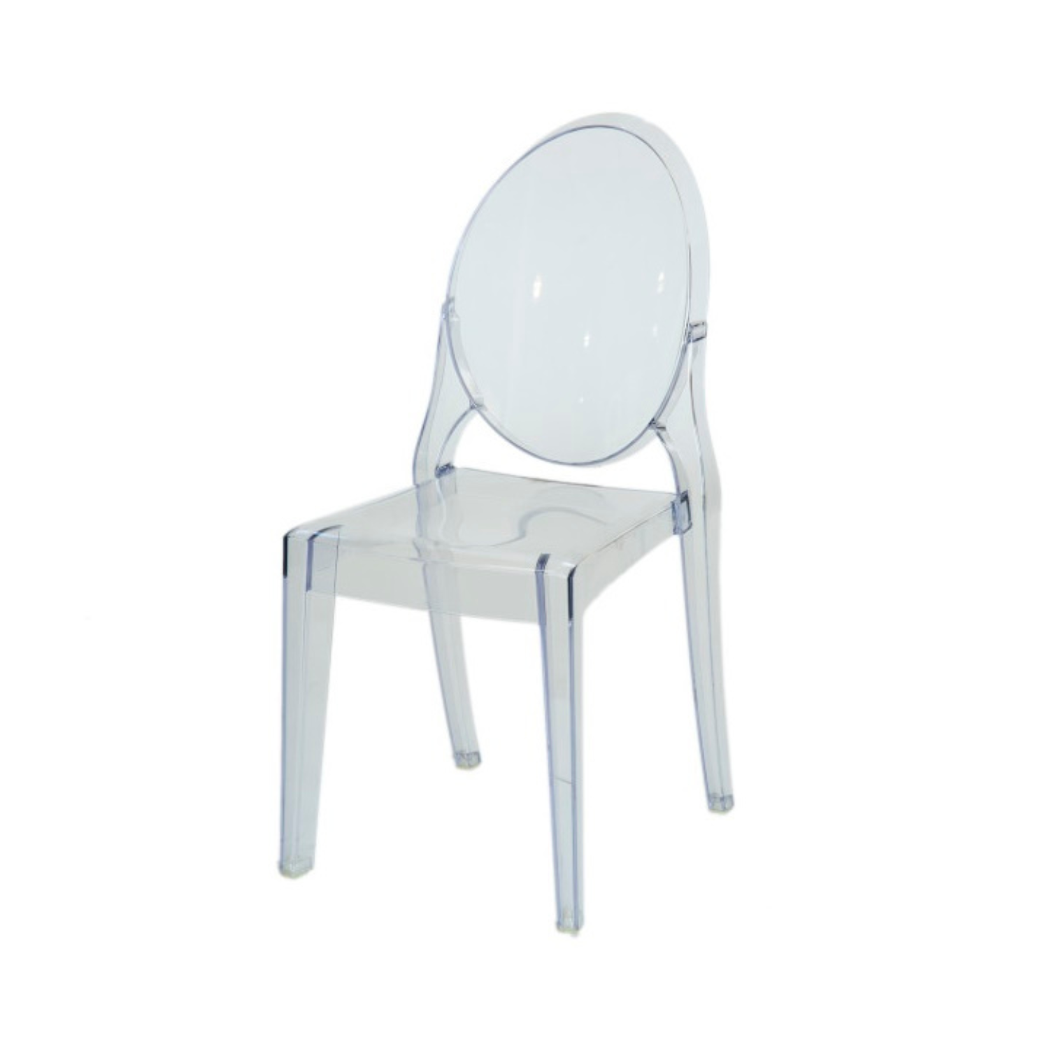 This modern ghost chair features a transparent acrylic construction with a sleek oval back and seamless design that creates an illusion of floating elegance. The crystal-clear material and contemporary silhouette blend effortlessly into any setting while making a bold style statement. The durable polycarbonate frame offers surprising comfort and stability, while the see-through aesthetic adds visual lightness and sophistication to event spaces.