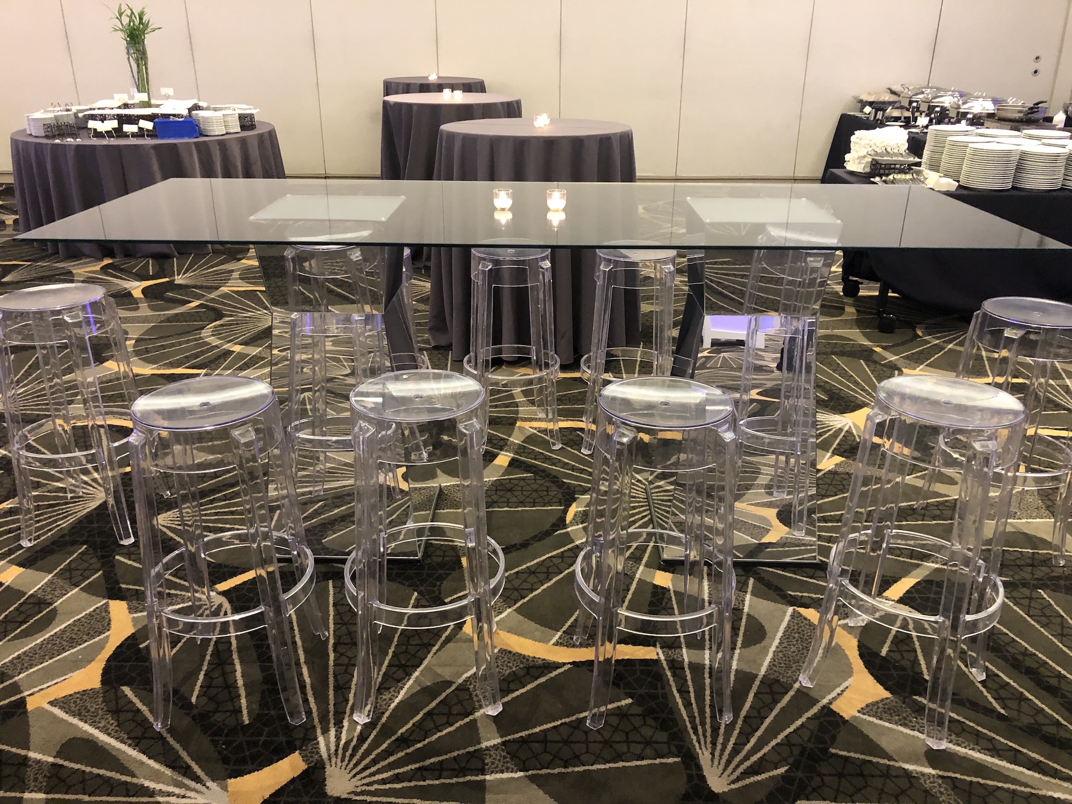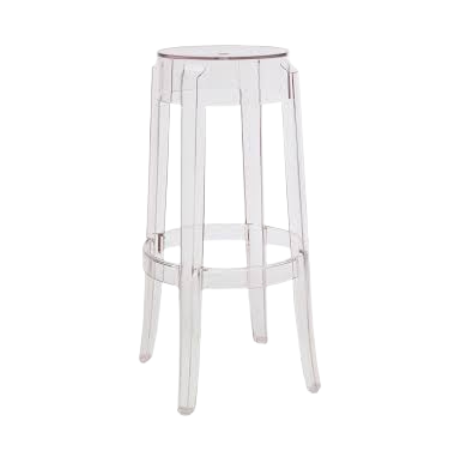 This modern ghost barstool features transparent acrylic construction with a sleek round seat and tapered legs that create a floating, ethereal aesthetic. The crystal-clear design adds contemporary sophistication while maintaining visual lightness and versatility in any space.