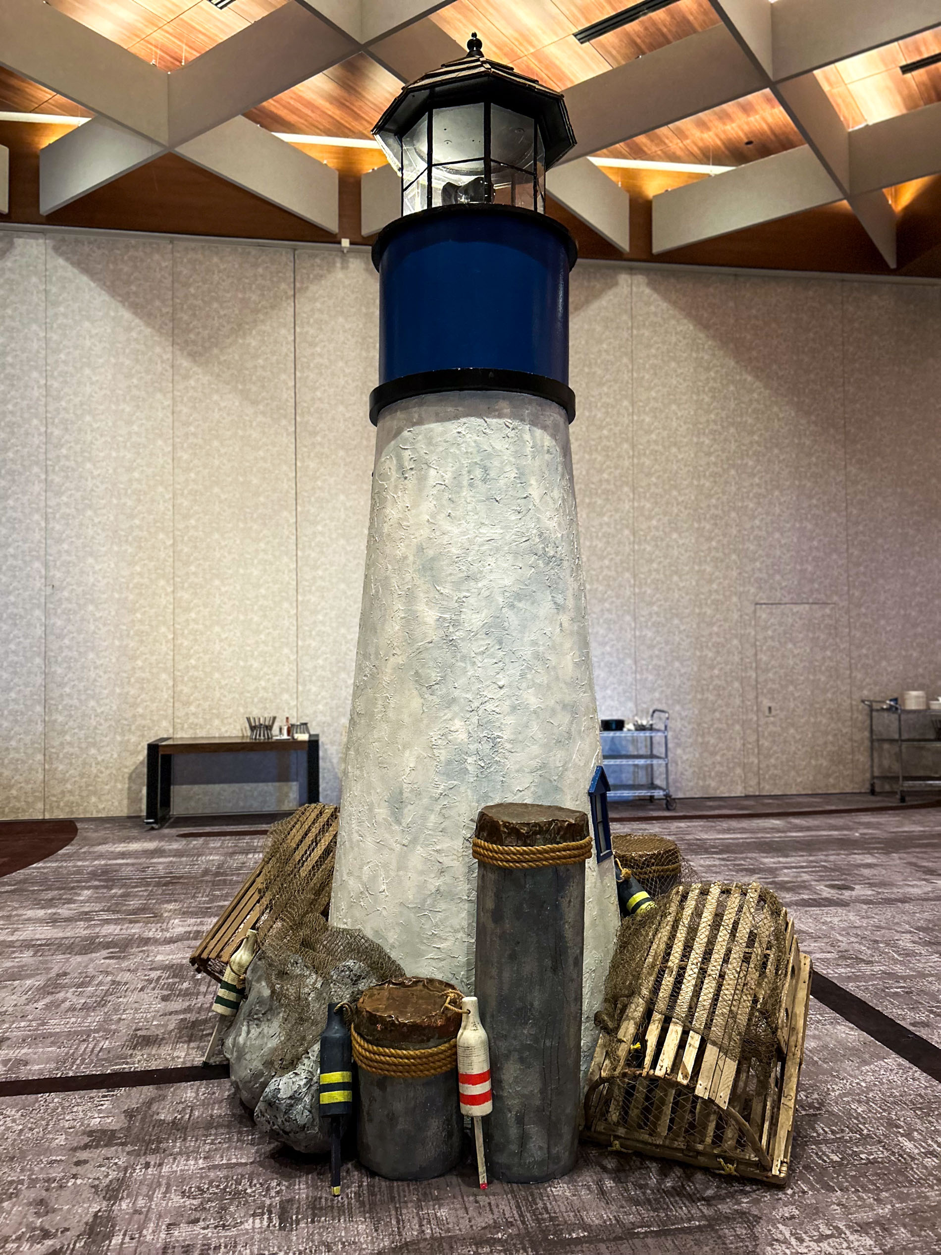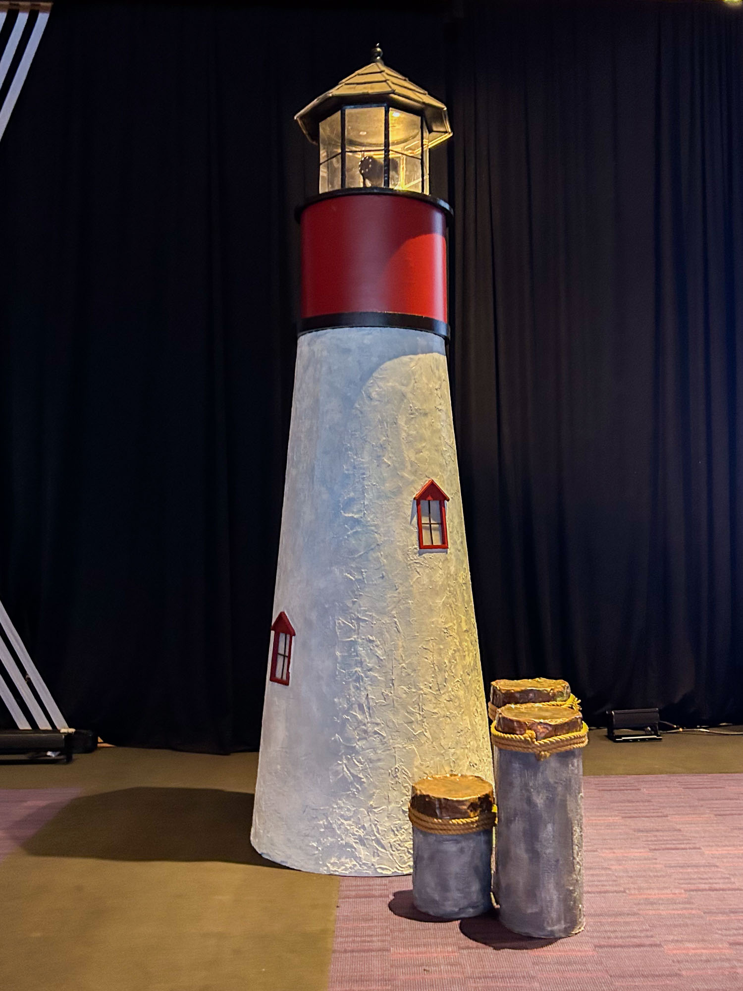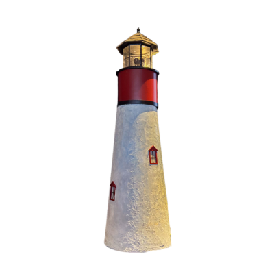 This charming lighthouse prop features classic red and white design with illuminated beacon top, textured tower walls, and authentic window details for coastal character.