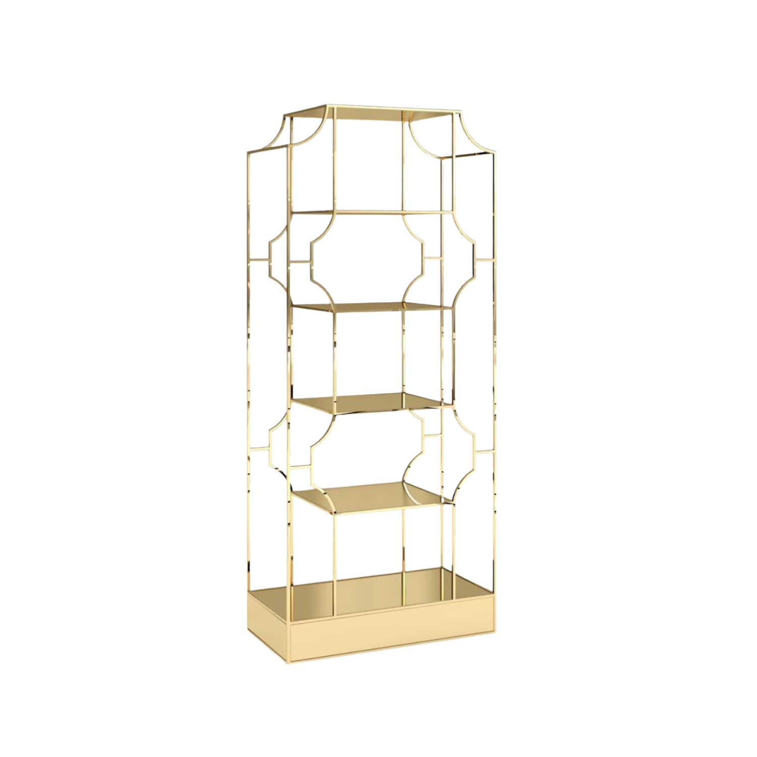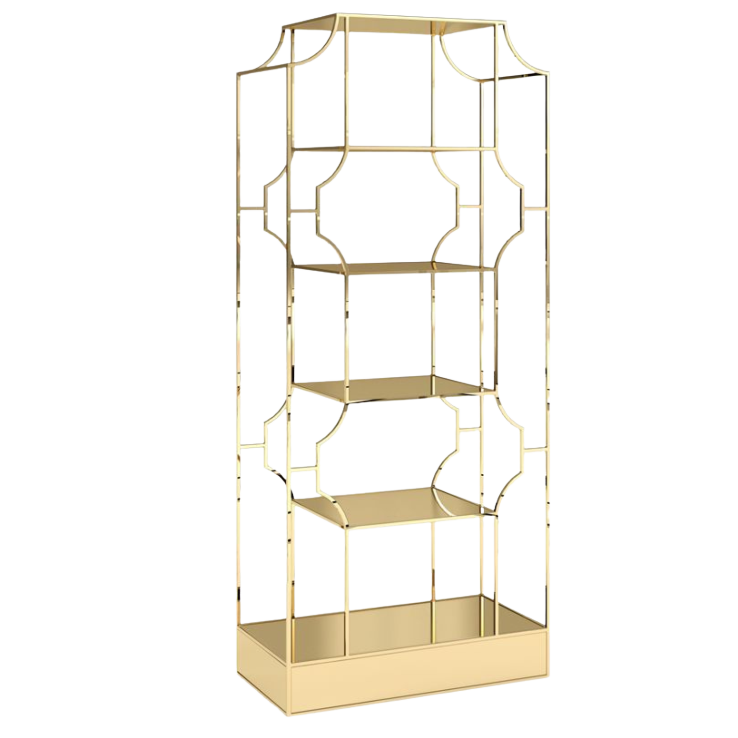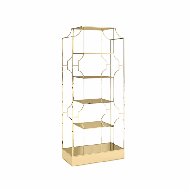 The Gold Glamour Bar Back features stunning geometric gold framework with Asian-inspired octagonal details and tiered shelving. This dramatic piece brings Hollywood Regency elegance and vertical display sophistication to any bar.