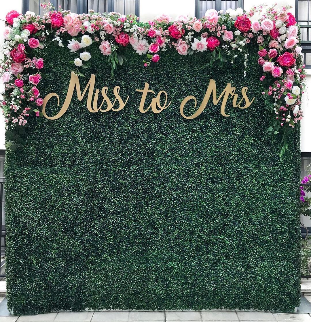 Perfect for weddings, bridal showers, bachelorette parties, engagement celebrations, ceremony backdrops, reception styling, photo booth installations, sweetheart table backdrops, cake table styling, rehearsal dinners, anniversary parties, birthday celebrations, baby showers, quinceañeras, sweet sixteen parties, garden party themes, all-white weddings, spring events, summer celebrations, corporate events, luxury gatherings, and elegant photo opportunities requiring customizable hedge wall backdrop with flexible floral arrangements and optional personalized messaging for romantic garden elegance and sophisticated natural atmosphere.