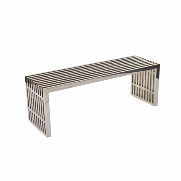This striking modern bench features a bold architectural design with sleek stainless steel construction and parallel linear slat detailing. The contemporary geometric silhouette creates dramatic visual interest while providing functional seating for upscale venues.