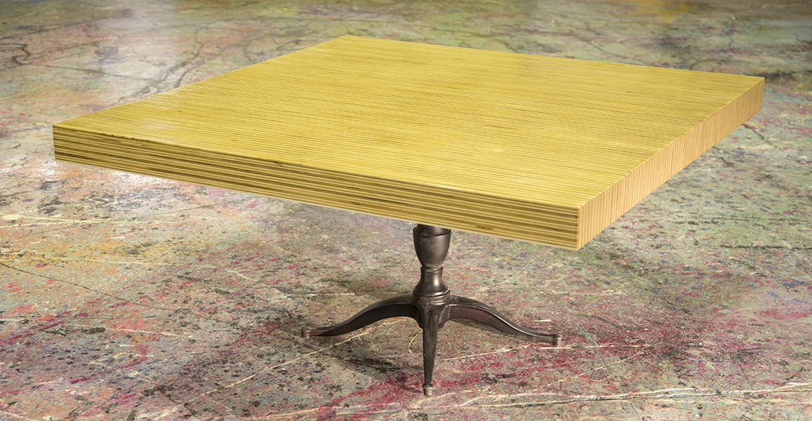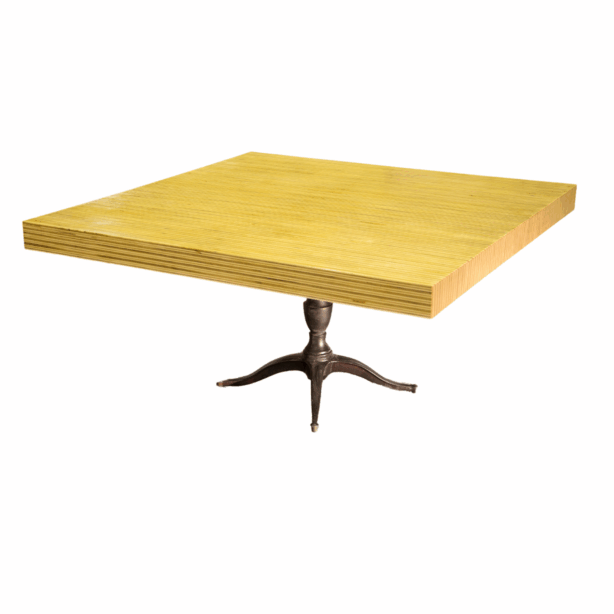 This unique table pairs a thick blonde wood top with distinctive horizontal ribbed texture with an ornate vintage-style dark metal pedestal base. The mix of industrial and classic elements creates an unexpected look that’s both rustic and refined. The substantial square top sits on a traditional tripod base for an eclectic vibe.