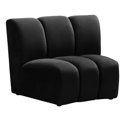 This bold modular sectional features dramatic vertical channel tufting in sophisticated black velvet upholstery with a distinctive curved design. The plush cushioning and sculptural silhouette create versatile seating configurations perfect for contemporary lounge environments.
