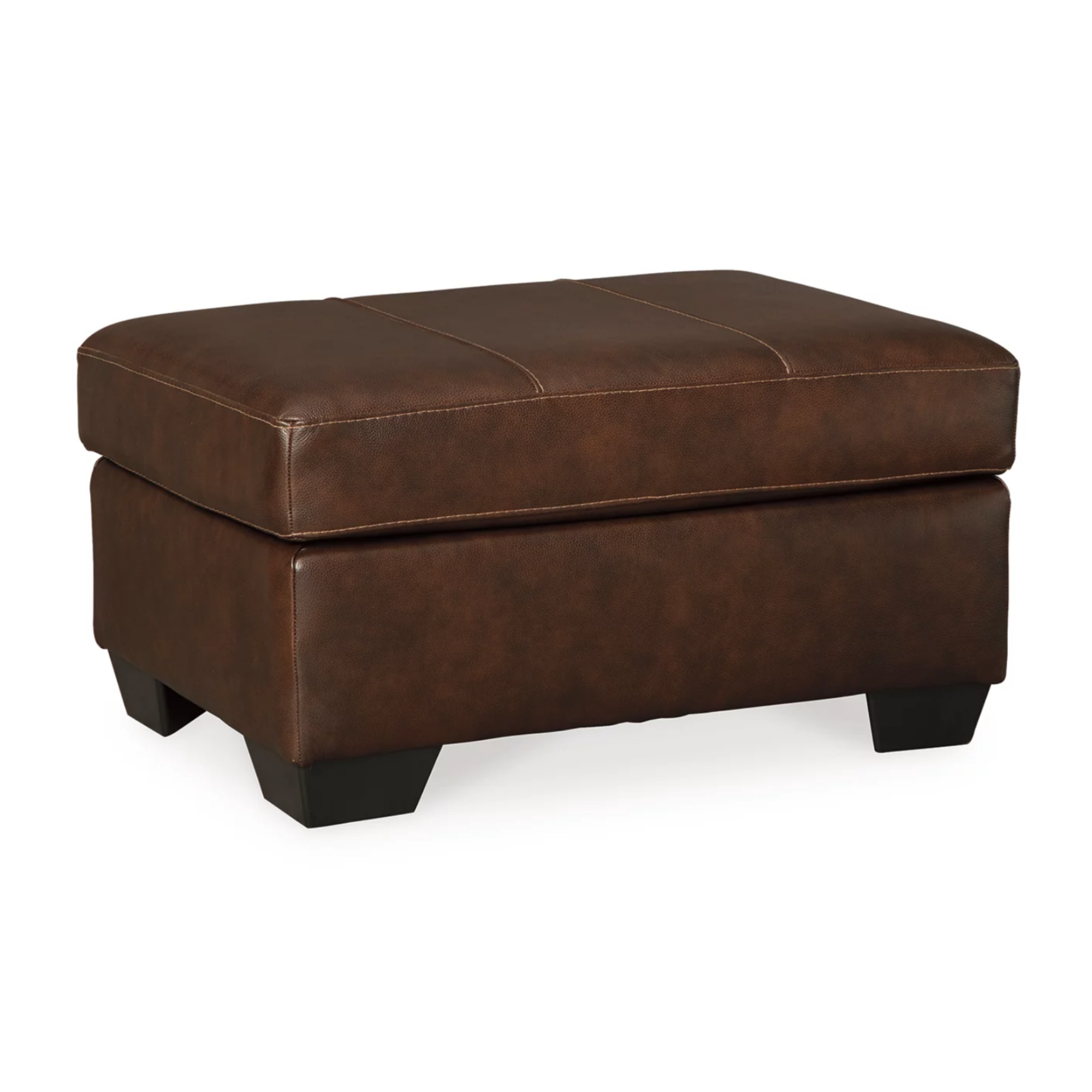 This classic leather ottoman features rich brown faux leather upholstery with clean contemporary lines, generous cushioned top with contrasting stitching details, and sturdy block feet. The versatile design with durable construction and warm neutral finish creates functional seating that serves as a footrest, extra seating, or accent piece, bringing sophisticated comfort and timeless style to any lounge setting.