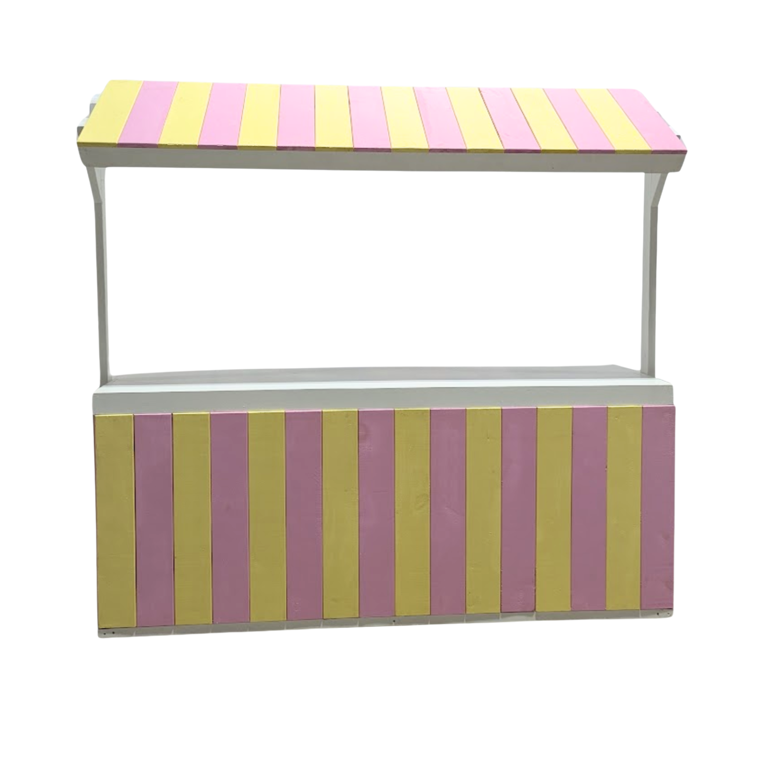 The Lemonade Bar brings cheerful, vintage charm with its bright striped canopy and classic market stand design. Featuring bold yellow and pink (or customizable) stripes, a protective awning, and spacious display shelf, this nostalgic setup evokes sunny summer days and old-fashioned refreshment stands. Perfect for showcasing beverages, desserts, or branded displays with irresistible curb appeal.