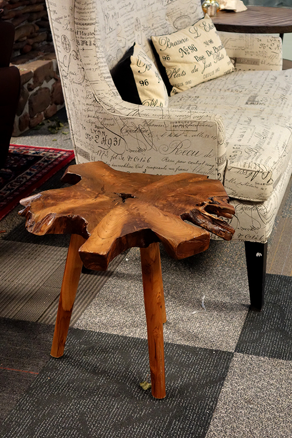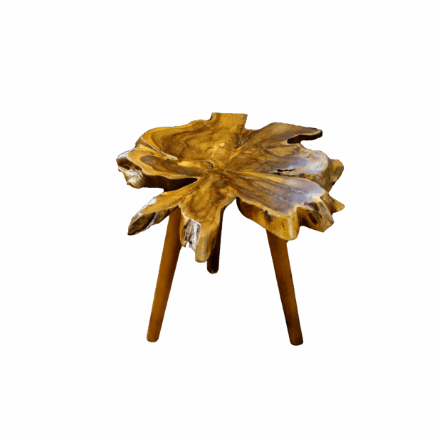 This unique organic accent table features a natural live edge wood slab top with irregular flowing edges and rich golden wood grain, supported by simple tapered legs. The raw beauty and one-of-a-kind sculptural form celebrate nature’s artistry, creating a stunning conversation piece that adds rustic elegance and earthy sophistication to lounge settings.