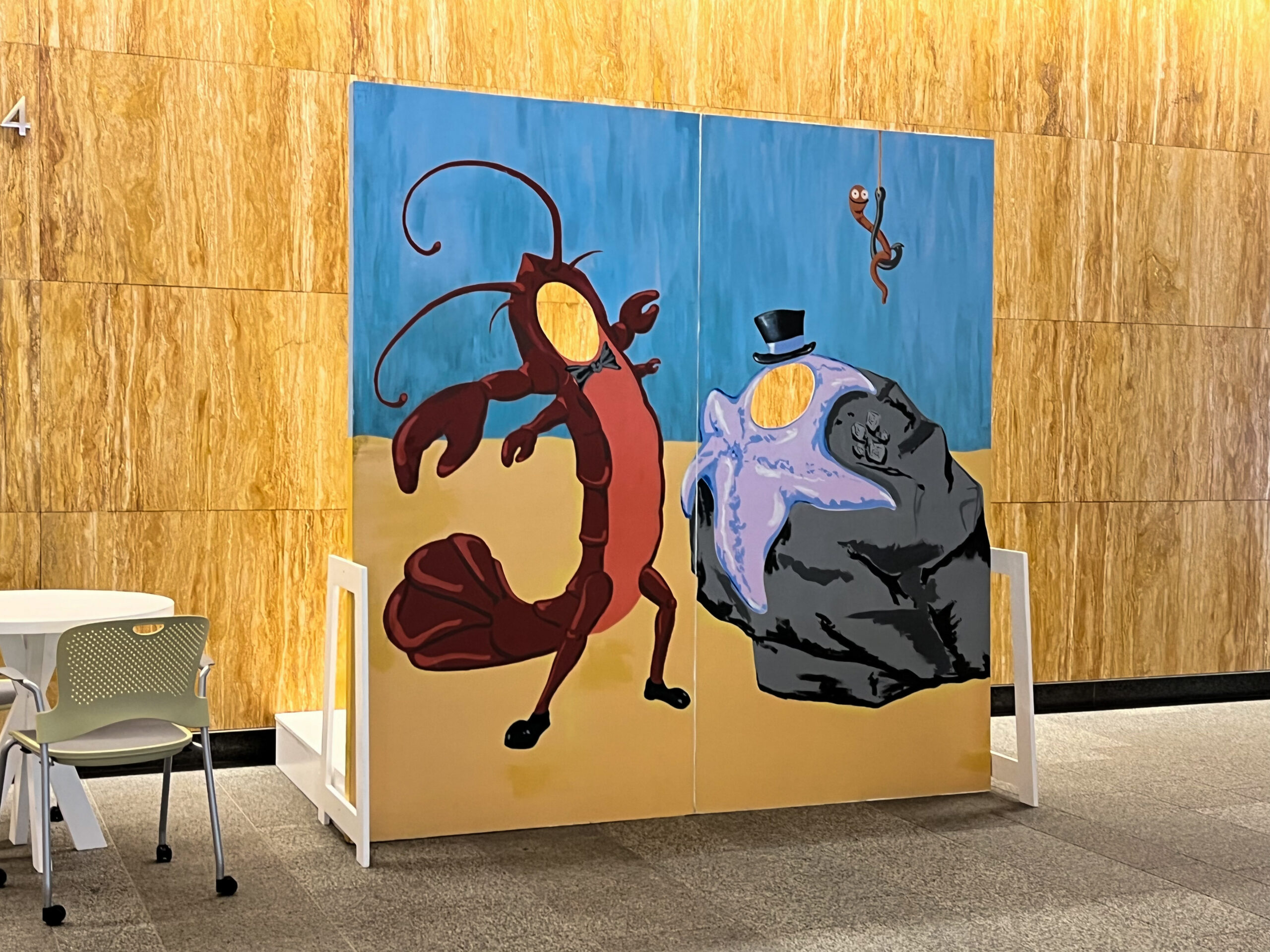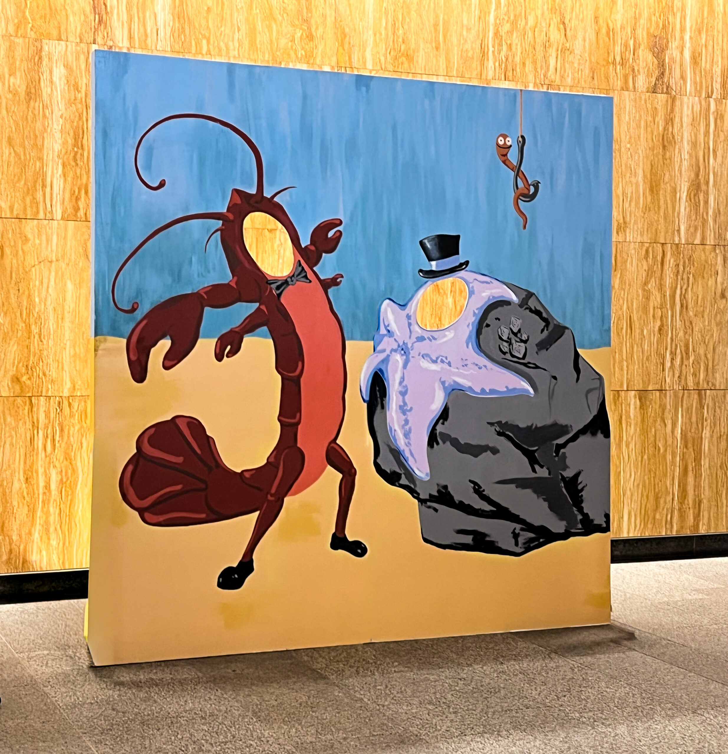 This whimsical photo opportunity board features hand-painted cartoon-style characters including friendly ant with flowing red cape and long curled antennae, plump caterpillar wearing top hat and bow tie, small worm dangling from fishing line, dual face cutout openings for interactive photo experiences, sandy desert floor with blue sky background, white frame structure, and playful animated character styling, offering entertaining photo moments and family-friendly atmosphere for children’s events and playful celebrations.