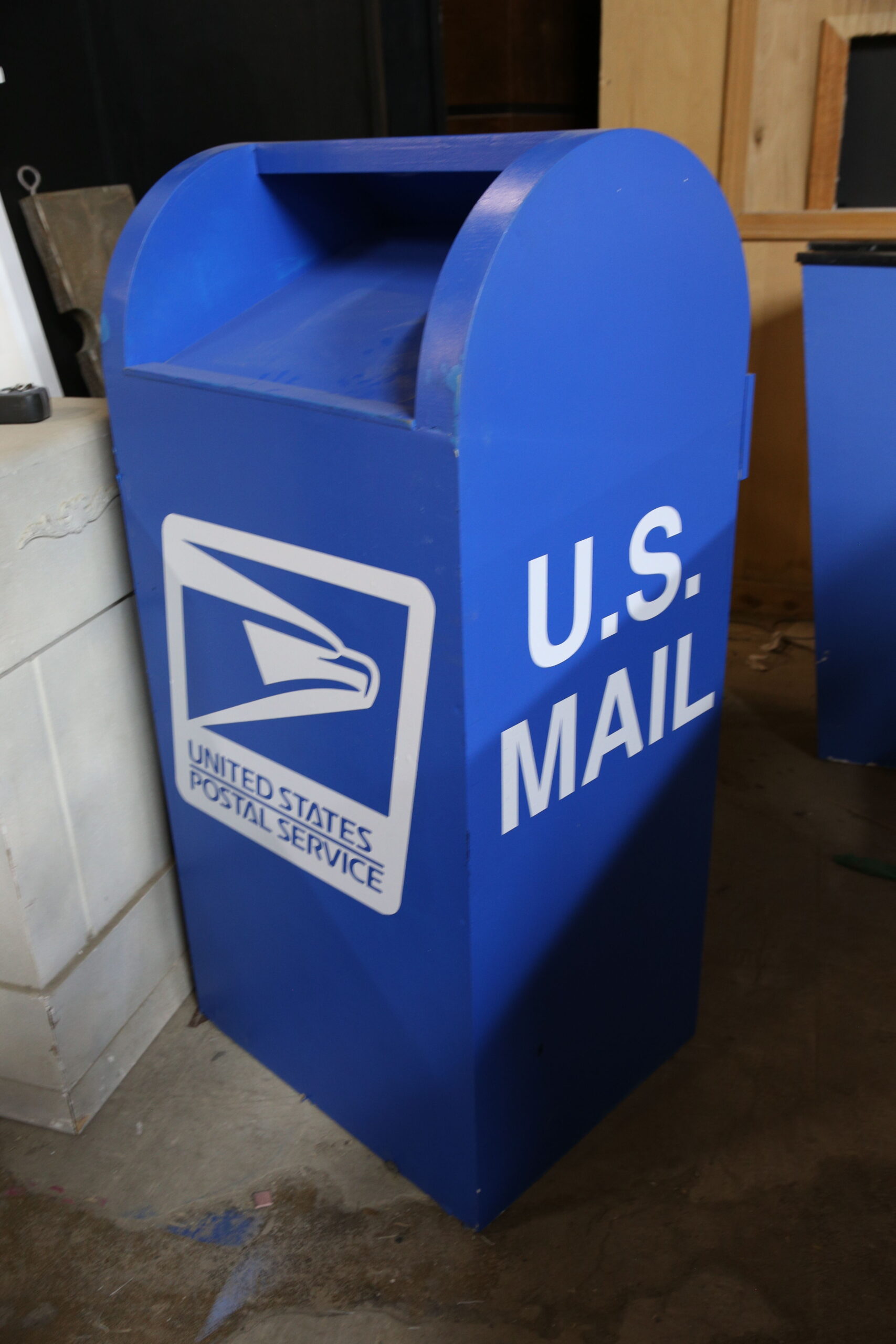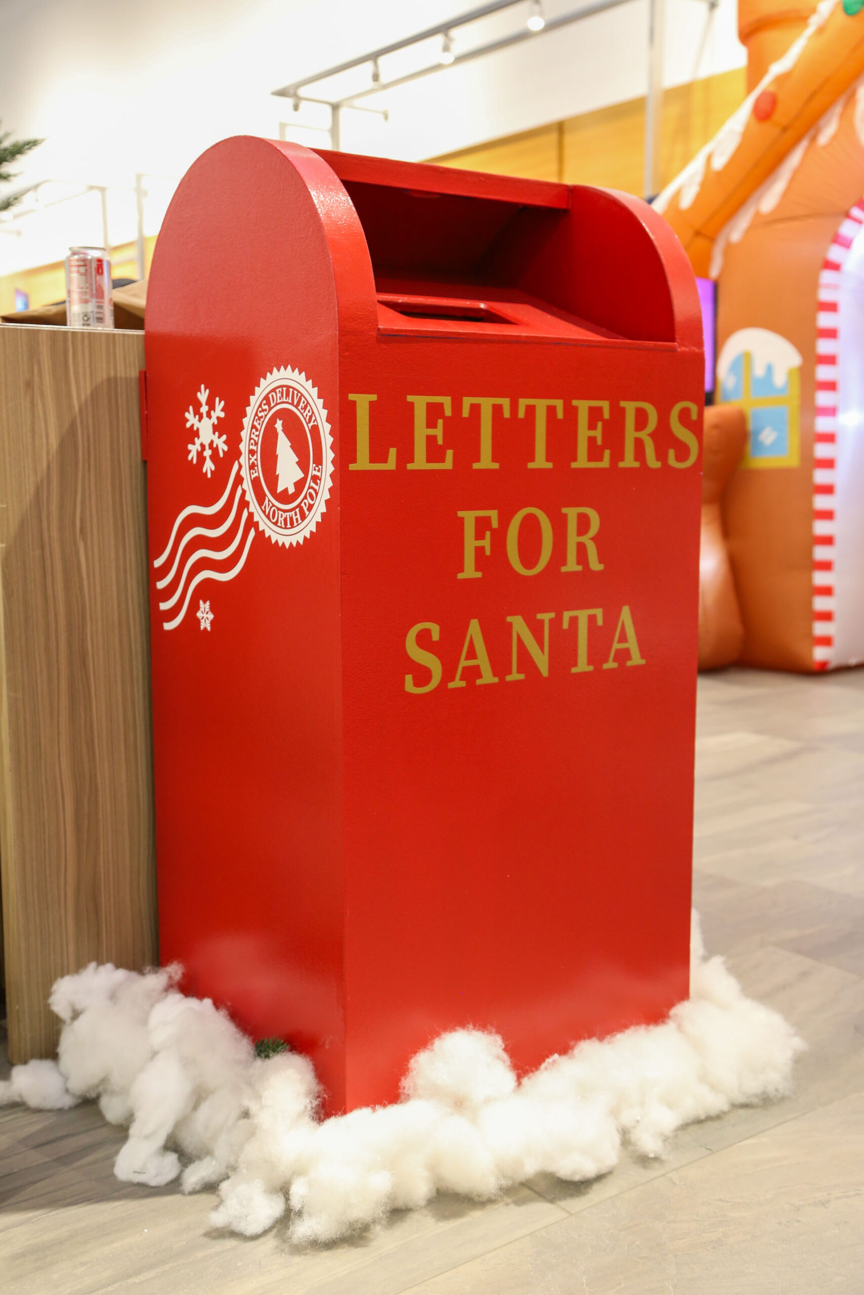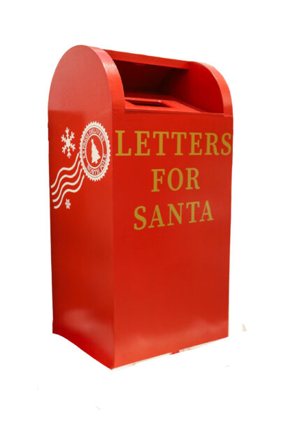 This customizable oversized mailbox features classic arched mailbox design with functioning mail slot opening, currently shown in vibrant red with gold “LETTERS FOR SANTA” lettering, North Pole postal seal with Christmas tree silhouette, white snowflake and decorative stripe elements, fluffy white cotton snow drift base, and fully customizable color and graphic options allowing complete branding personalization for any theme, event, or organization, offering versatile interactive mailbox experience adaptable to diverse celebrations and promotional activations.