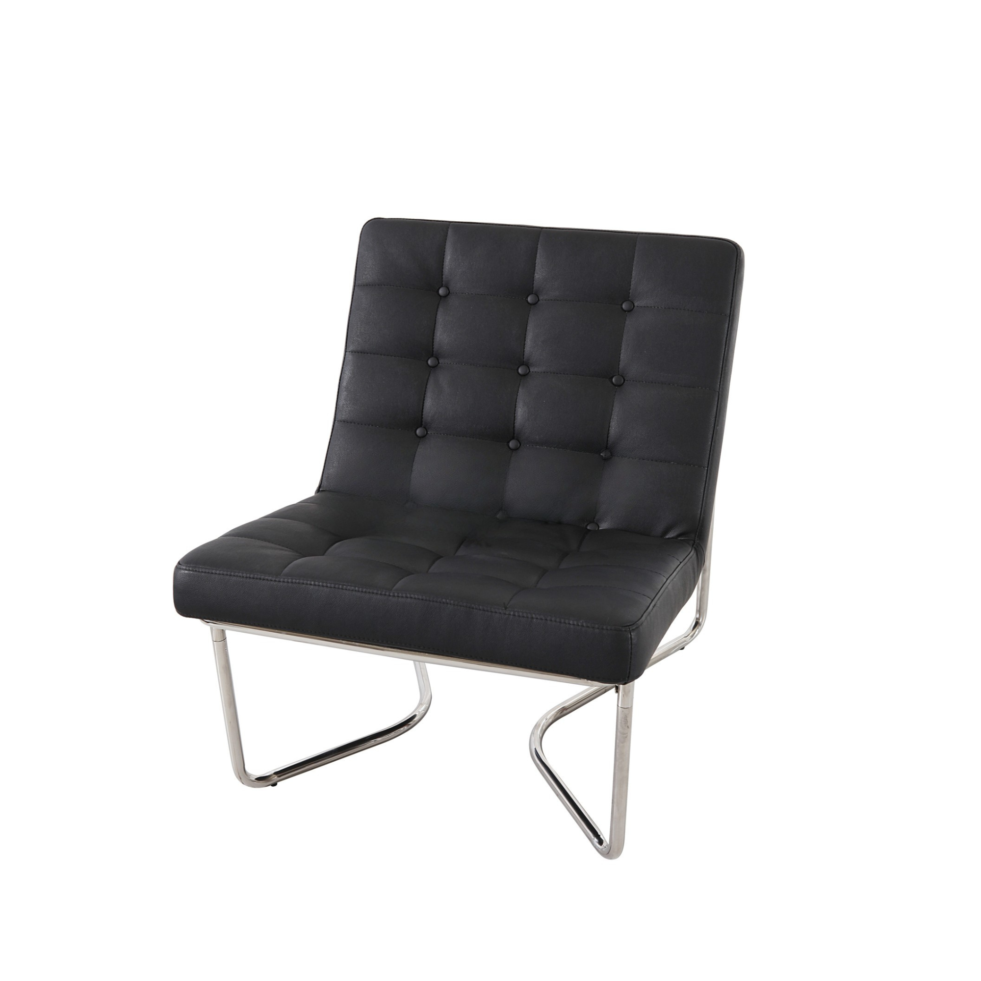 This iconic mid-century modern lounge chair features black leather upholstery with classic button-tufted grid pattern and sleek curved stainless steel X-frame base. The timeless design with clean lines creates sophisticated architectural seating perfect for upscale contemporary spaces.