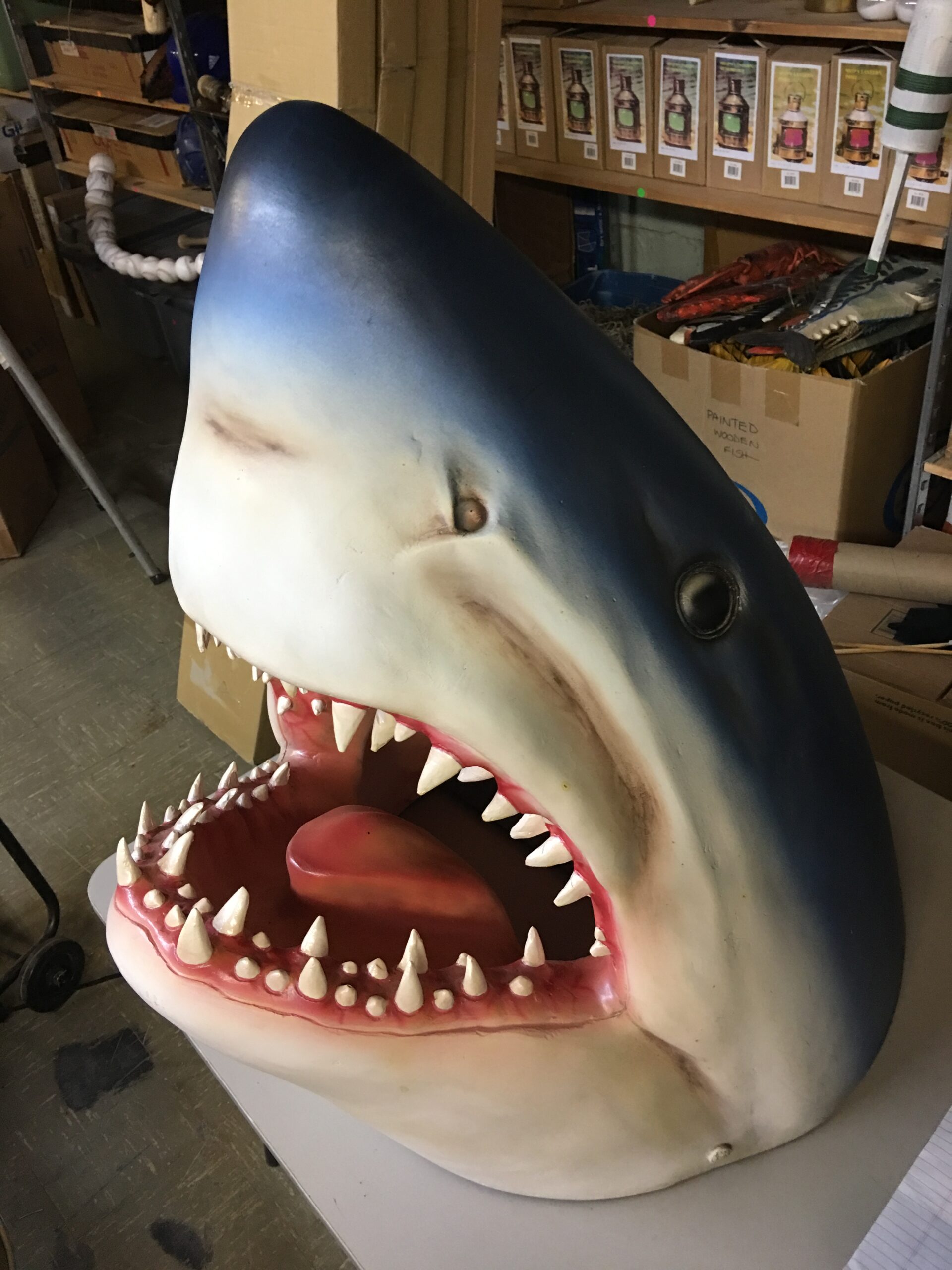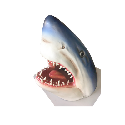 This menacing shark head prop features realistic gray-blue coloring, sharp white teeth, and dramatic open-jawed design that brings oceanic thrills to any venue.