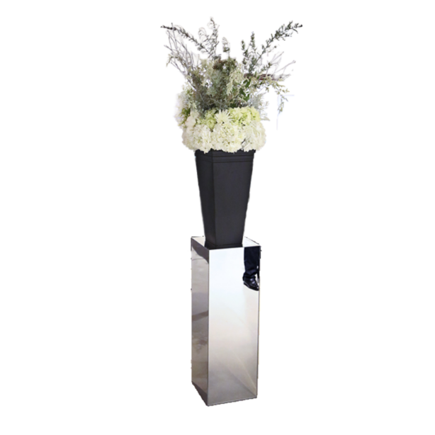 This tall mirrored display pedestal features sleek rectangular column construction with reflective mirror surface, modern minimalist design creating elegant sophistication, polished mirror finish reflecting surrounding decor and lighting, clean geometric lines, substantial height perfect for dramatic floral displays and centerpiece elevation, contemporary aesthetic with glamorous appeal, and versatile styling creating stunning visual impact through reflective surfaces that amplify venue lighting and decor.