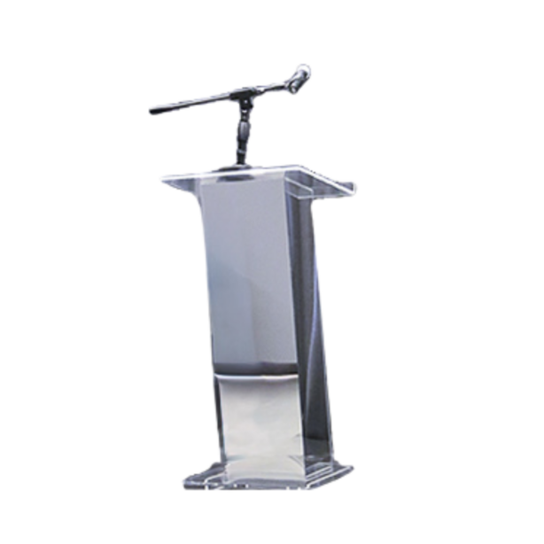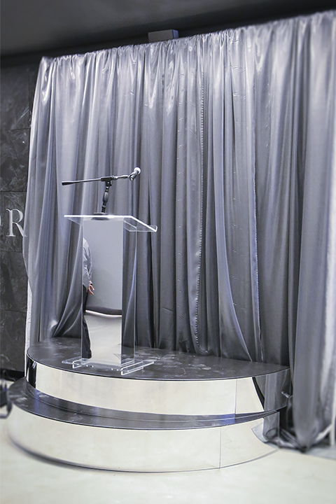 This elegant presentation stage setup features contemporary clear frosted acrylic podium with angular geometric design, flexible microphone mount, curved tiered platform stage with white base and dark upper trim creating dimensional effect, floor-to-ceiling silver-grey fabric backdrop curtains providing sophisticated neutral background, and modern minimalist aesthetic, offering professional speaking platform and polished corporate presence for upscale events, formal presentations, and luxury brand activations.