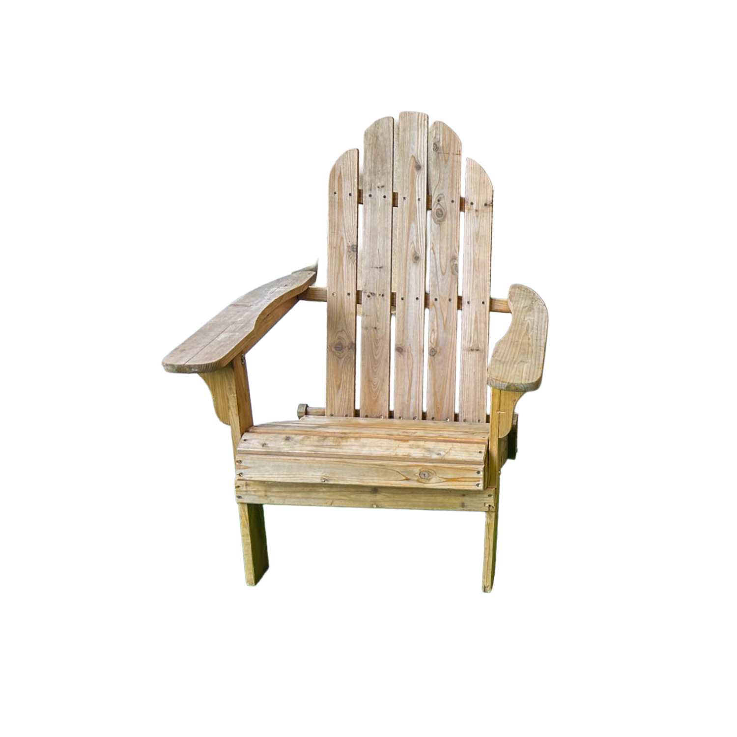 This classic Adirondack chair features natural weathered wood construction with the iconic fan-backed design, wide contoured armrests, and comfortable slanted seating. The authentic rustic finish with visible wood grain and traditional slatted design creates timeless coastal charm and relaxed outdoor seating that complements any casual or seaside setting.