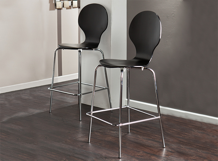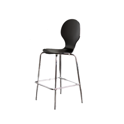 This modern Noir barstool features a sleek black molded seat with organic curved silhouette on a polished chrome frame. The minimalist design combines streamlined European styling with practical stackable construction for contemporary sophistication.