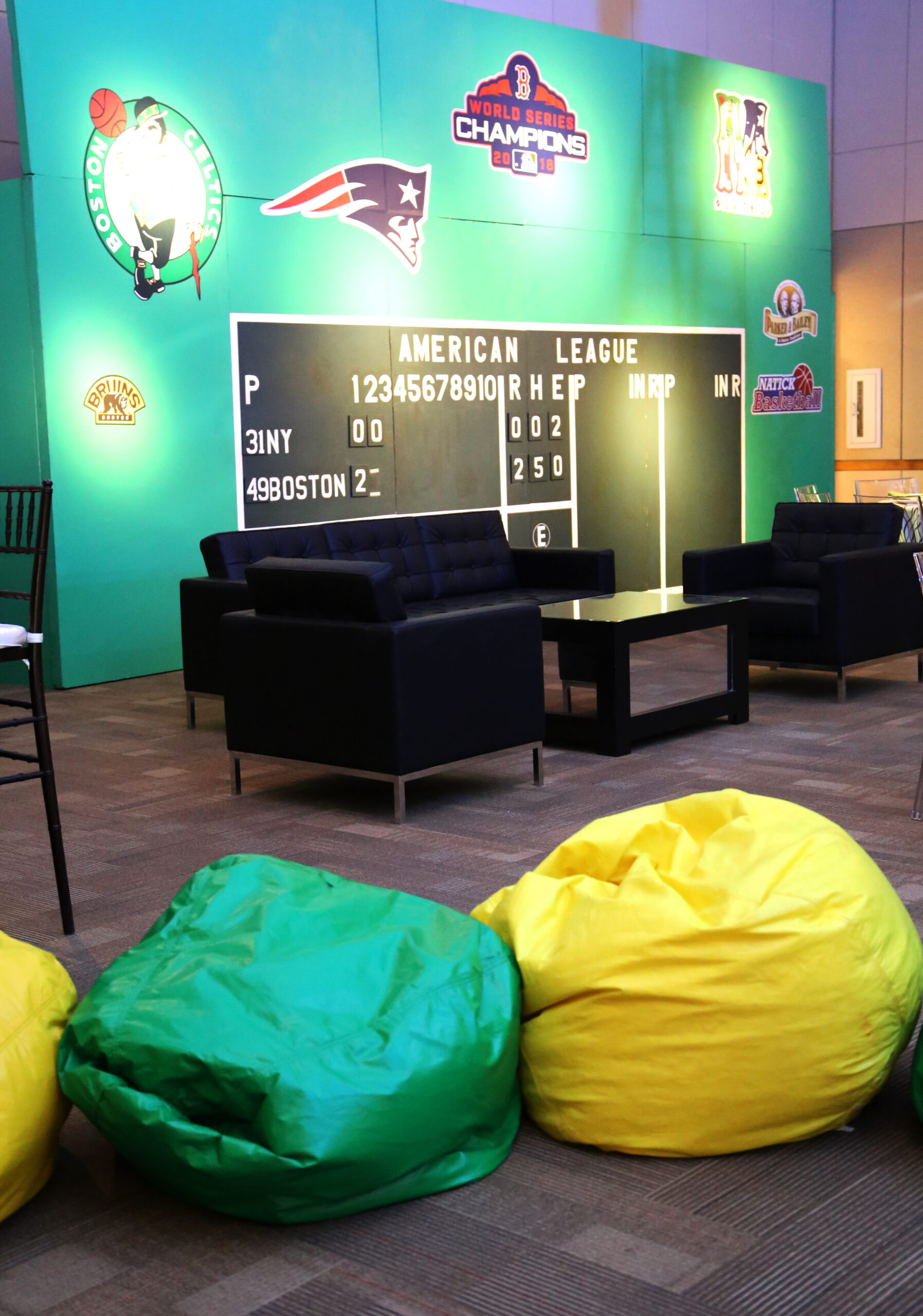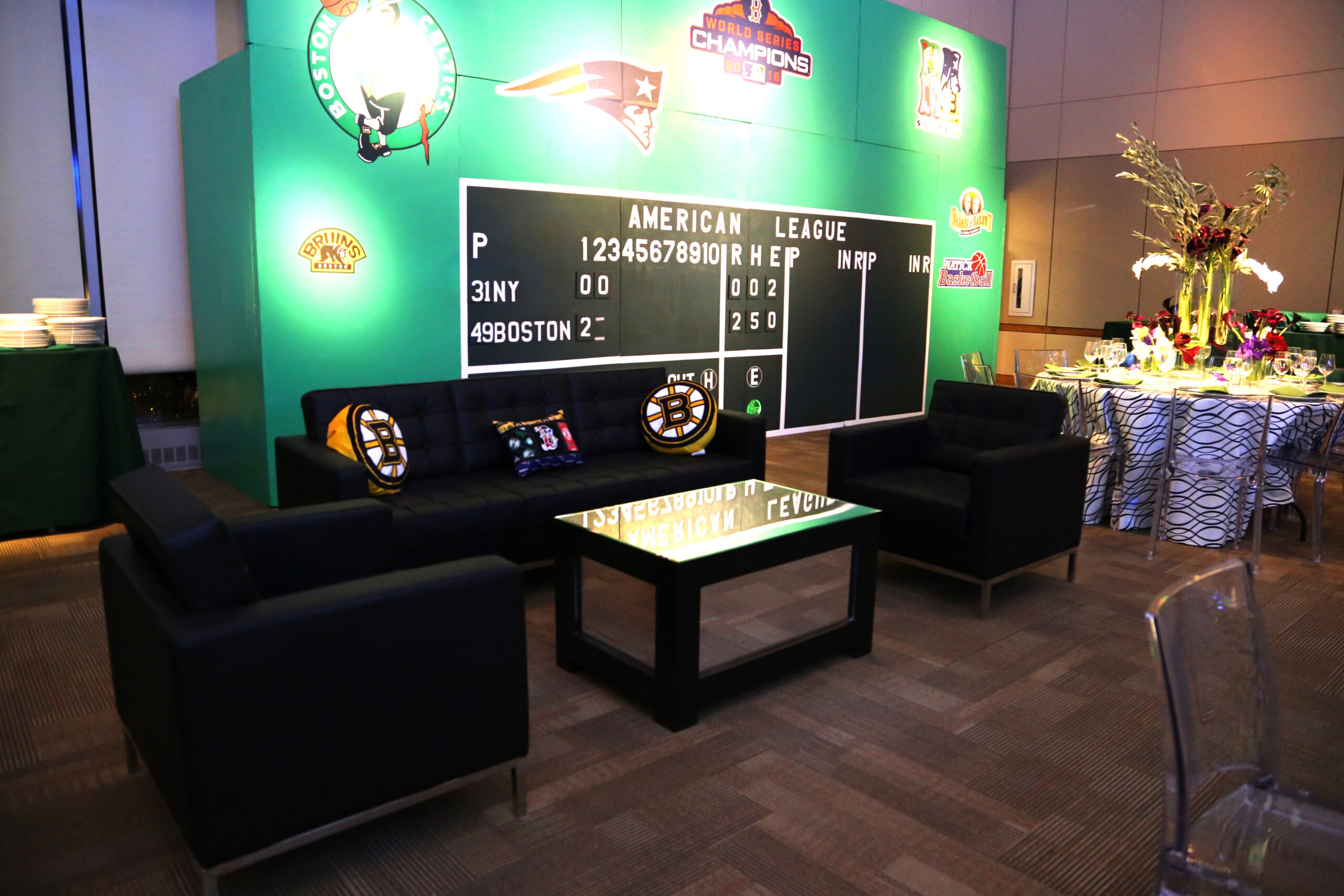 This contemporary sofa features black leather upholstery with button-tufted back cushions and clean track arms, elevated on sleek chrome legs. The modern design with tailored lines creates sophisticated seating for upscале lounge settings.