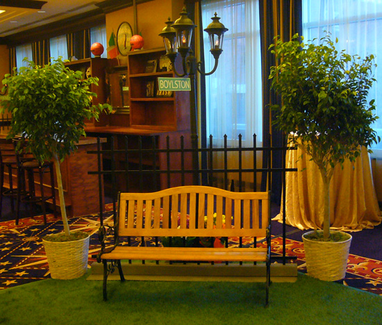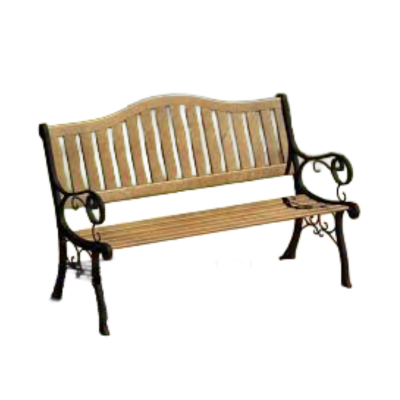 This charming park bench features natural wood slat construction with decorative wrought iron curved arms and ornate scrollwork details. The classic design with contoured back creates nostalgic outdoor seating perfect for garden and park-themed settings.