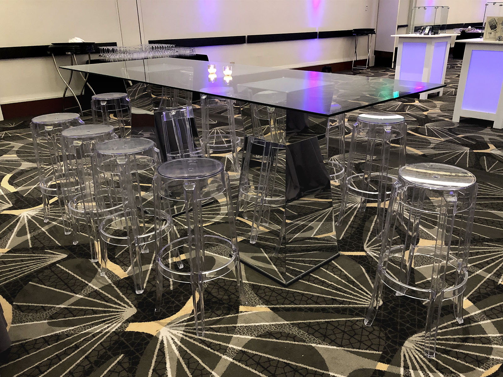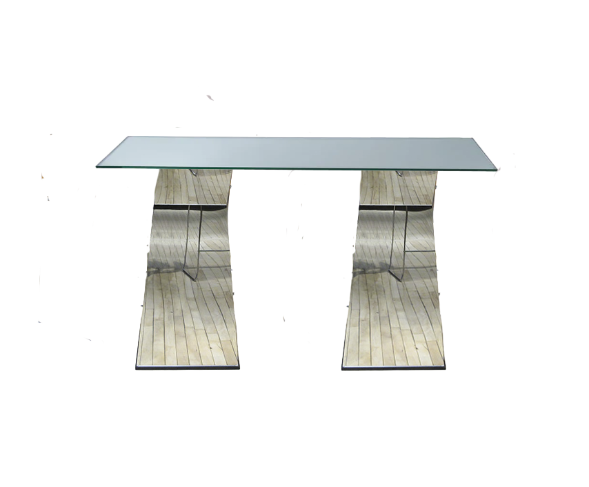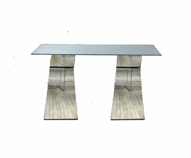 This striking contemporary table features a sleek glass top sitting on unique mirrored pedestal bases with a cool geometric design. The reflective surfaces bounce light around and create interesting visual effects, while the sculptural bases add architectural interest. The whole piece has a modern, almost futuristic vibe.